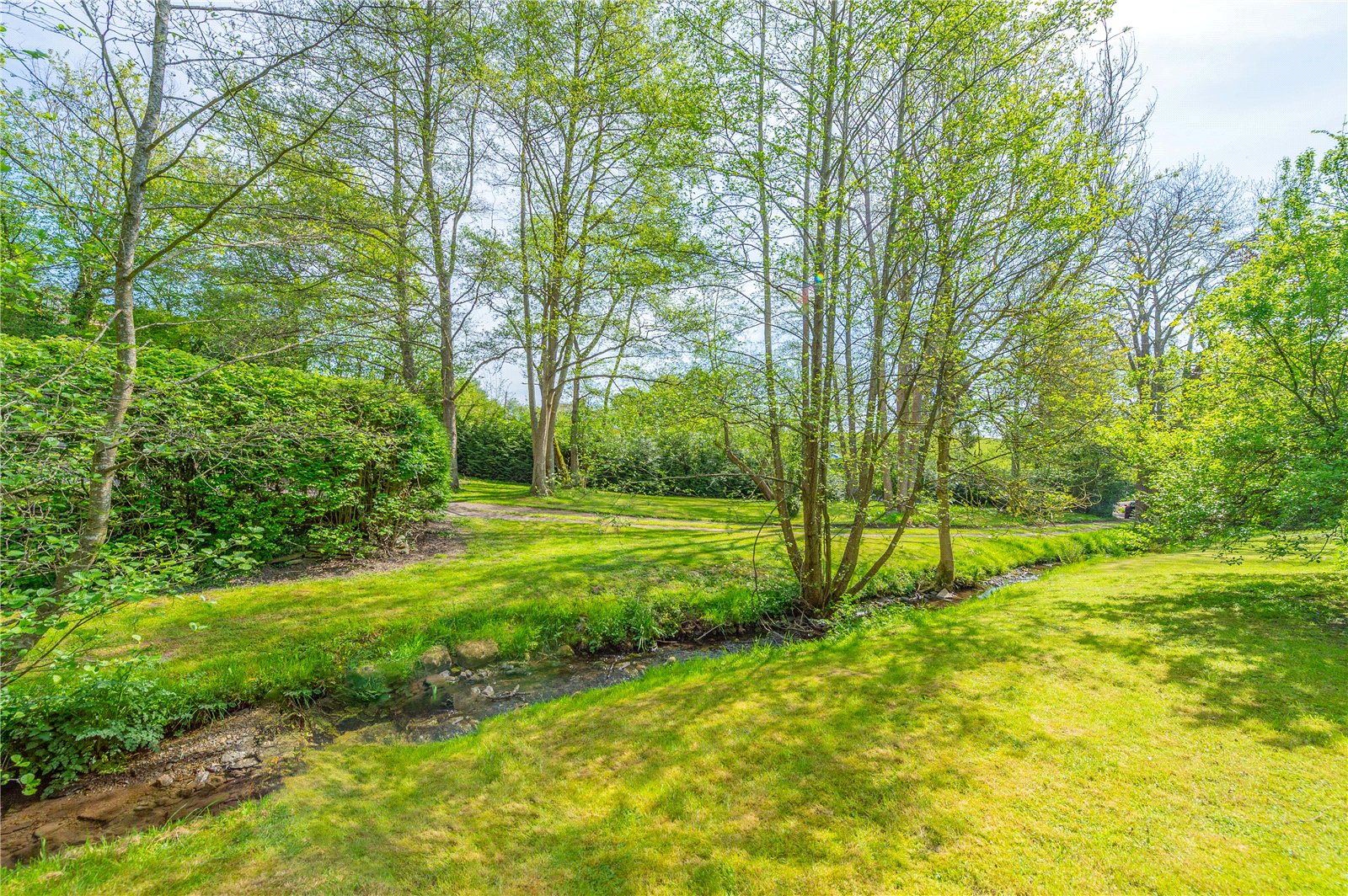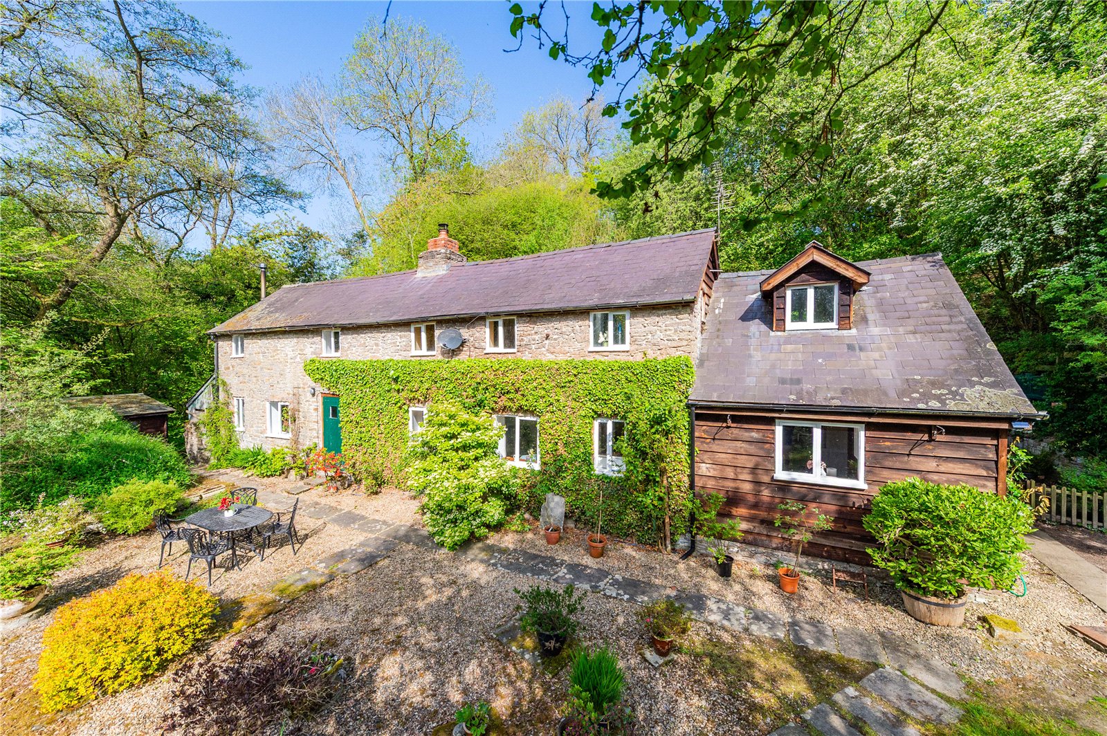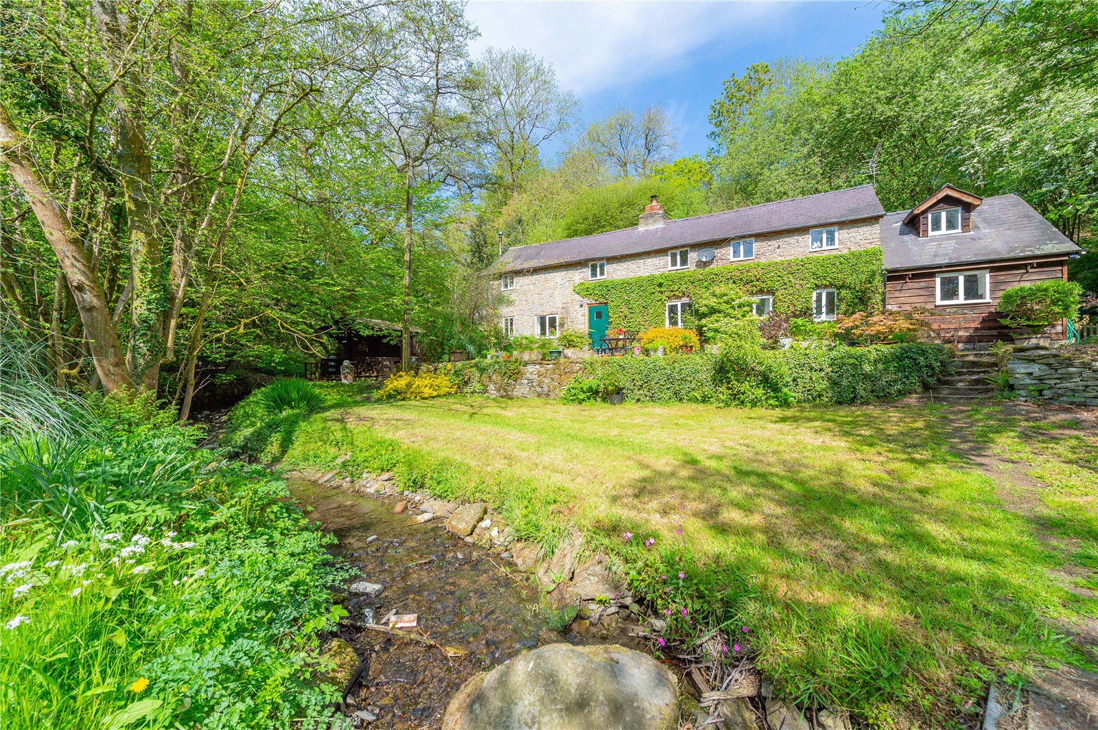 The cottage is approached from the no through road via a driveway lined with trees, leading to an ample parking area. There are pretty lawned gardens, established borders with a winding stream to the front plus a summerhouse.