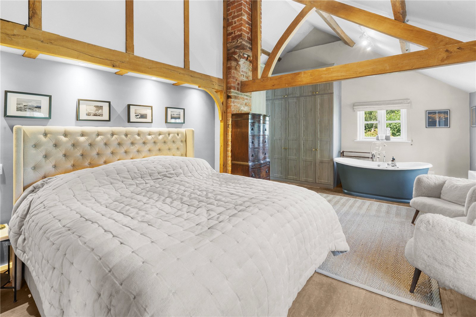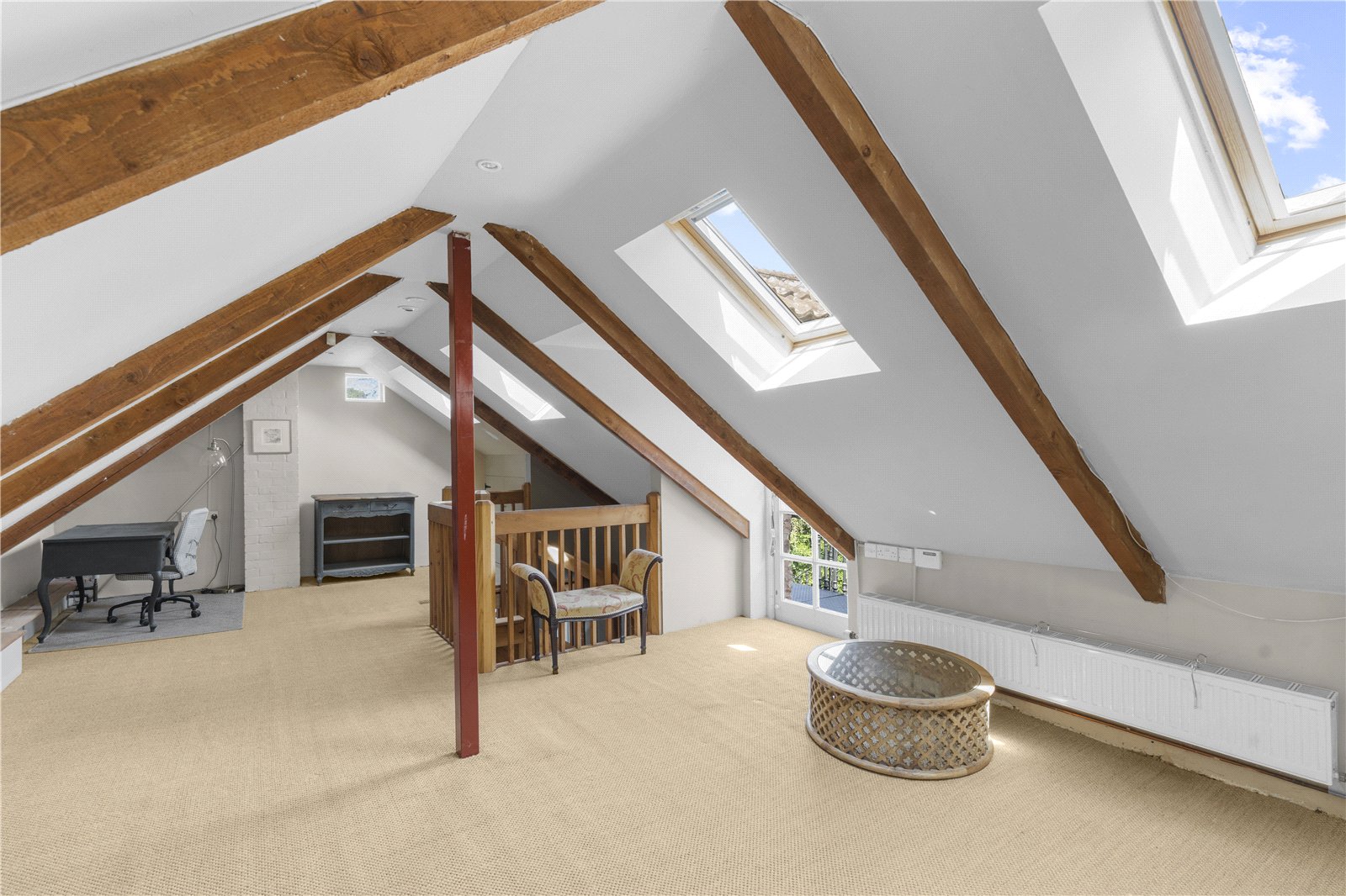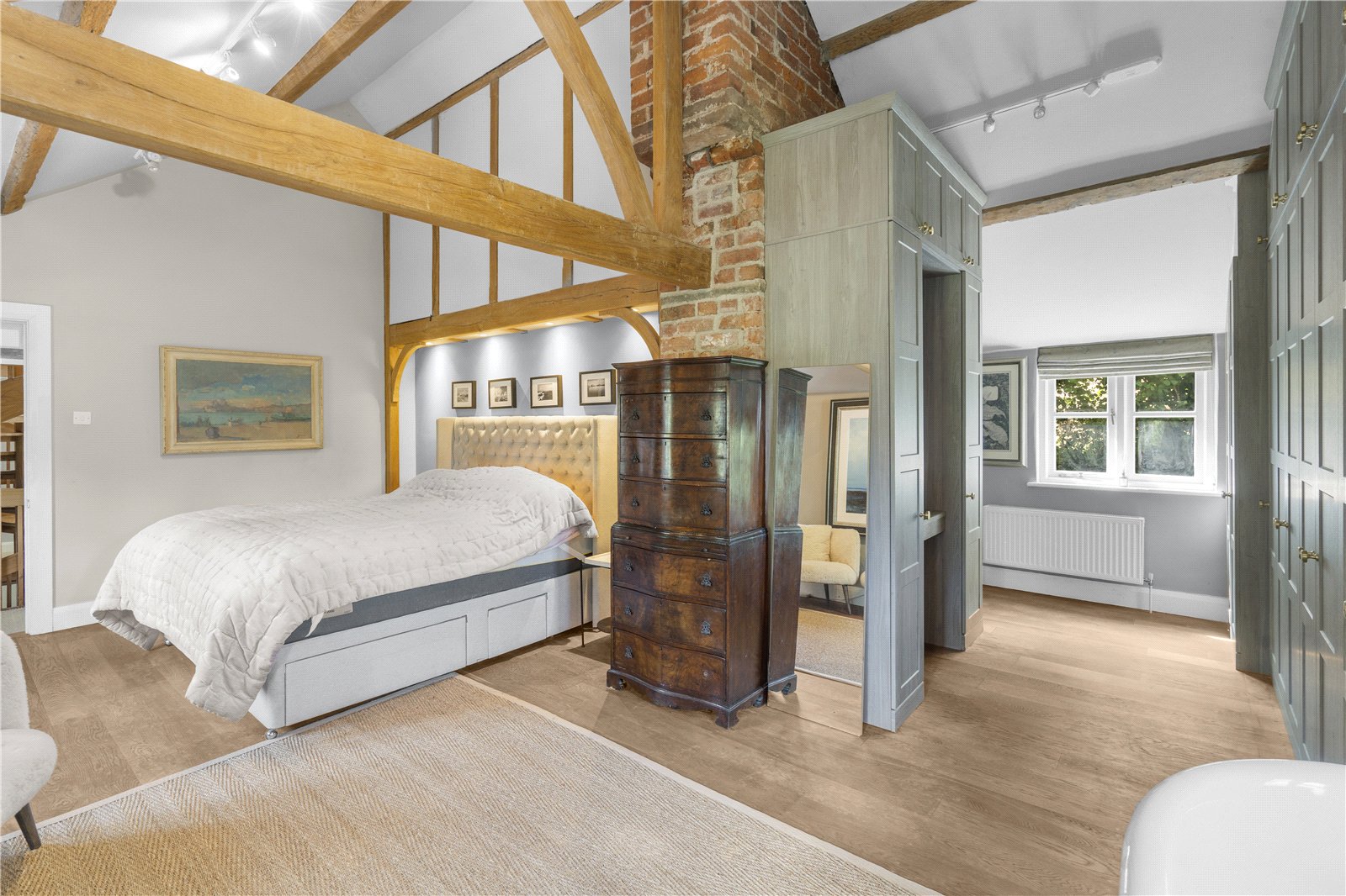 On the first floor, there is a galleried landing / library with two bedrooms both benefitting from en-suite facilities. The impressive master bedroom suite has a feature freestanding bath, oak floors, a vaulted ceiling and an en-suite shower room with built-in wardrobes. On the second floor there is a potential fourth bedroom currently used as a studio area with separate external access.