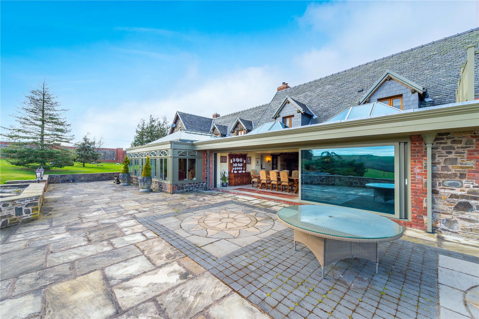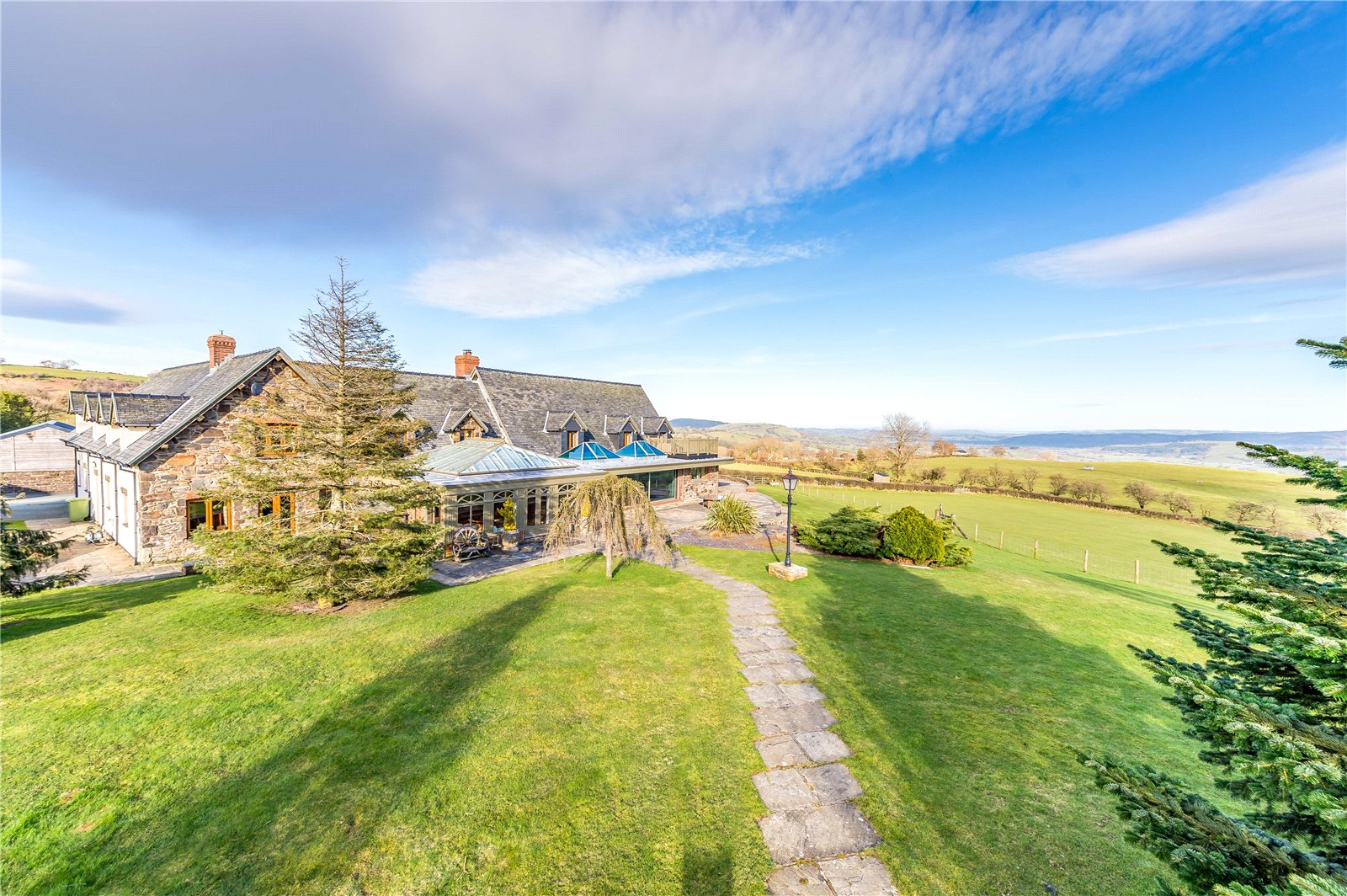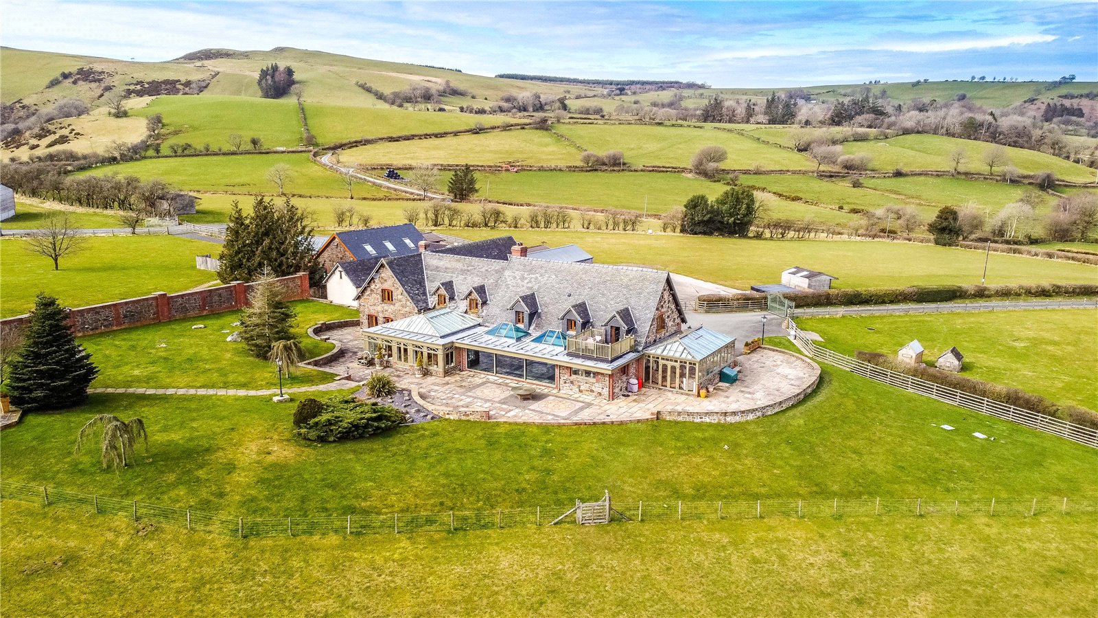 On arriving at Pen-Yr-Allt there is a double set of electric gates at either end of the drive. The house is set in 25.7 acres (10.4 ha), occupying a commanding position, with dramatic views all around the property over the Trannon Valley. The main house is a generous 6,700 sqft, four-bedroom property with a further range of outbuildings and stables. The entrance is impressive; the front door opens out into an imposing, cavernous hall with a Clearview log burner on the fireplace to the right, and a large dining table positioned in front of a bank of sliding windows which open onto the garden.