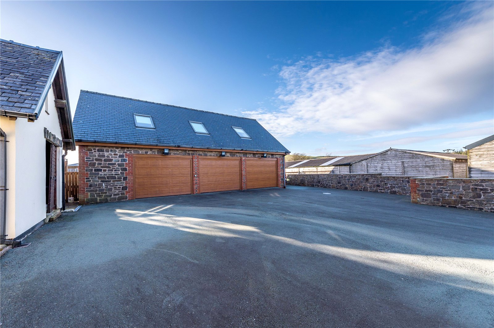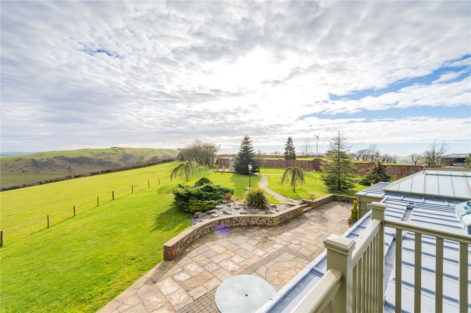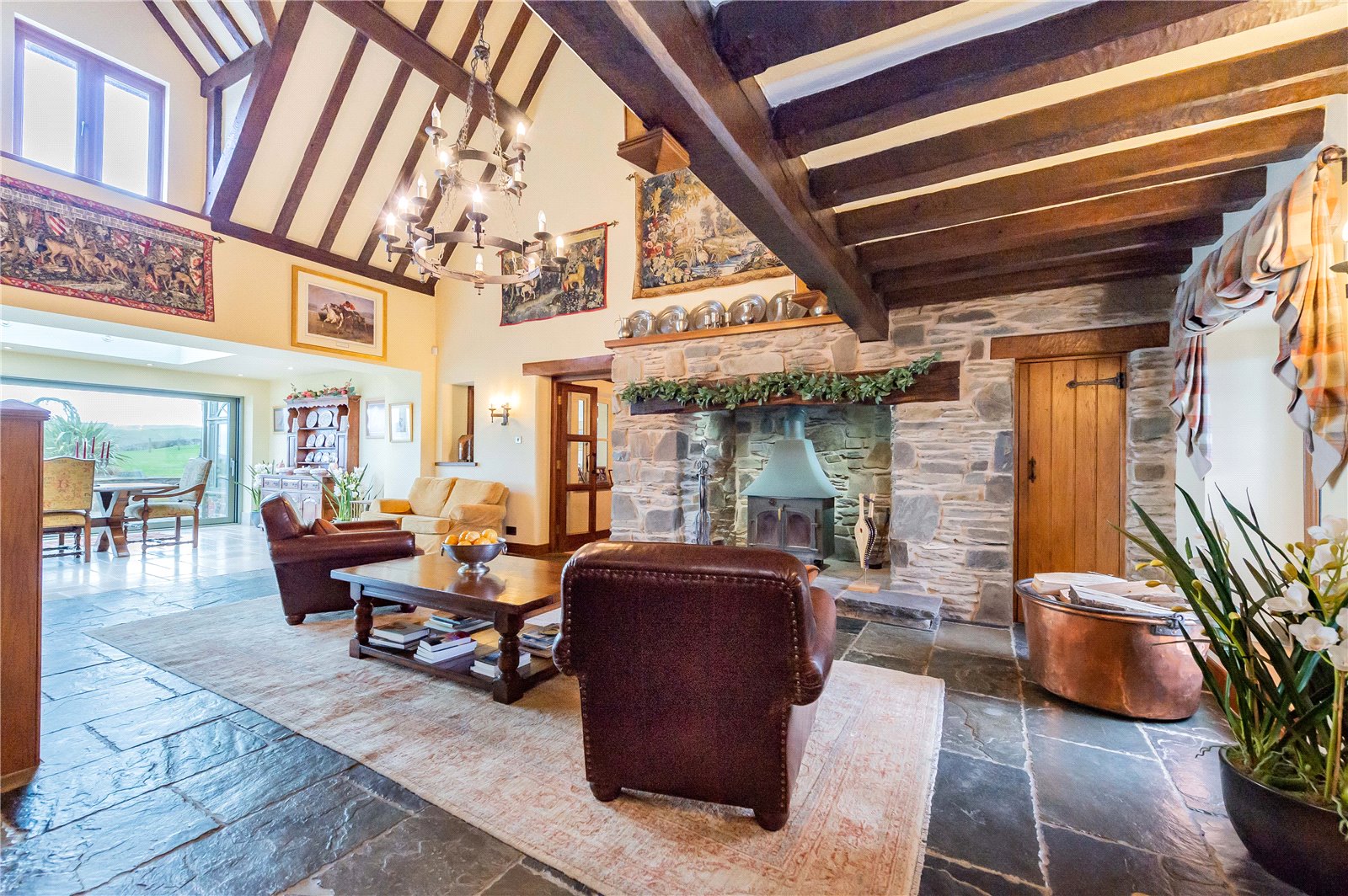 On arriving at Pen-Yr-Allt there is a double set of electric gates at either end of the drive. The house is set in 25.7 acres (10.4 ha), occupying a commanding position, with dramatic views all around the property over the Trannon Valley. The main house is a generous 6,700 sqft, four-bedroom property with a further range of outbuildings and stables. The entrance is impressive; the front door opens out into an imposing, cavernous hall with a Clearview log burner on the fireplace to the right, and a large dining table positioned in front of a bank of sliding windows which open onto the garden.