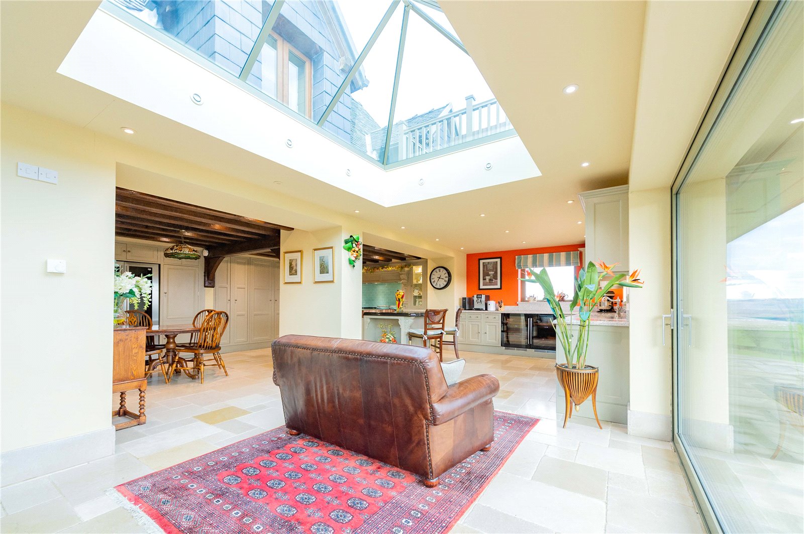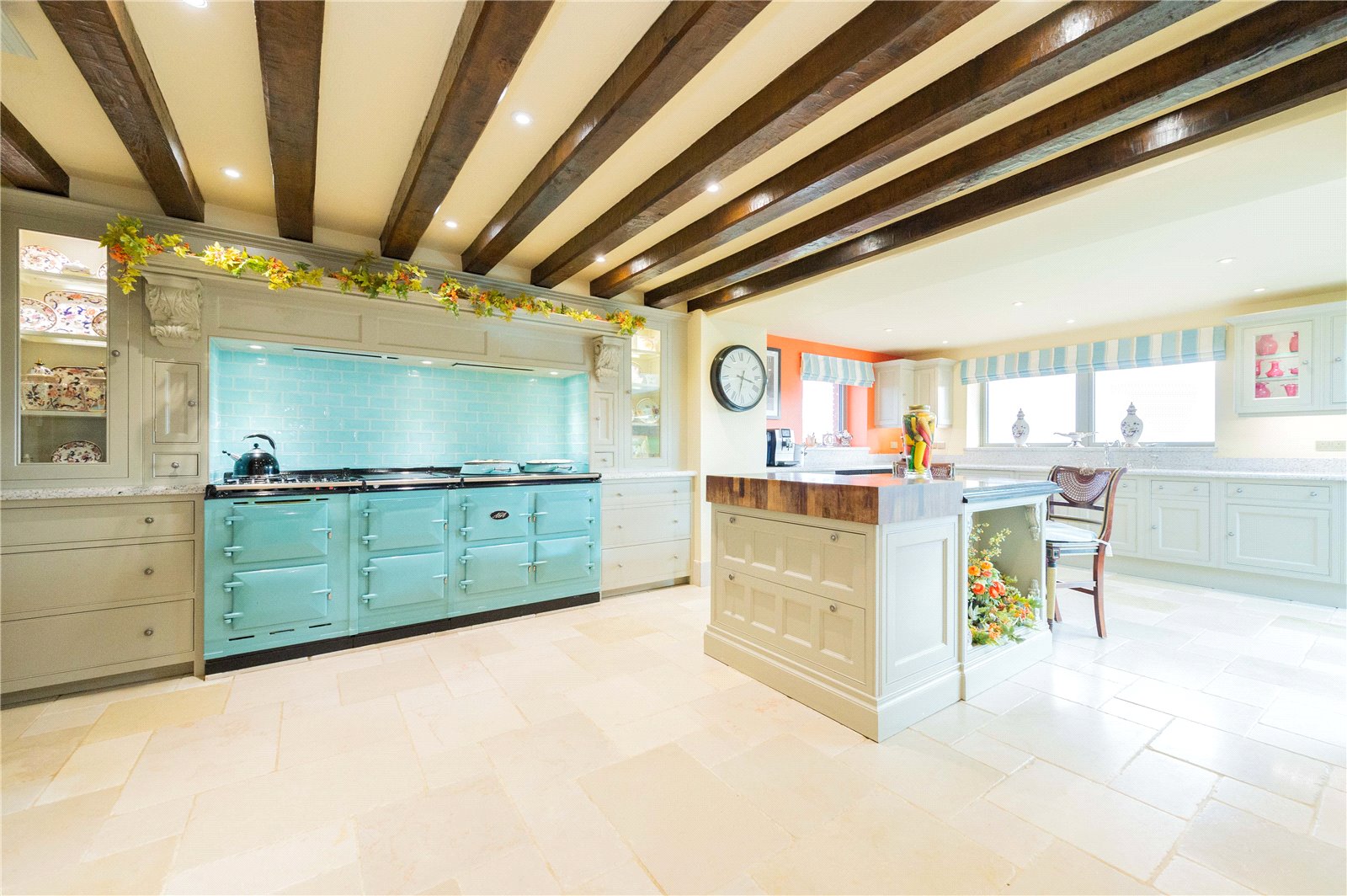 The dining room leads around to the left and into a large open plan kitchen/breakfast room with an electric, Total Control AGA, two further ovens and gas hobs. There are two dual-temperature wine coolers, a tall fridge, double sink, integrated dishwasher, space for an American style Fridge/Freezer with fitted full length cupboards either side, a styled, 60mm marble island and granite worktops.