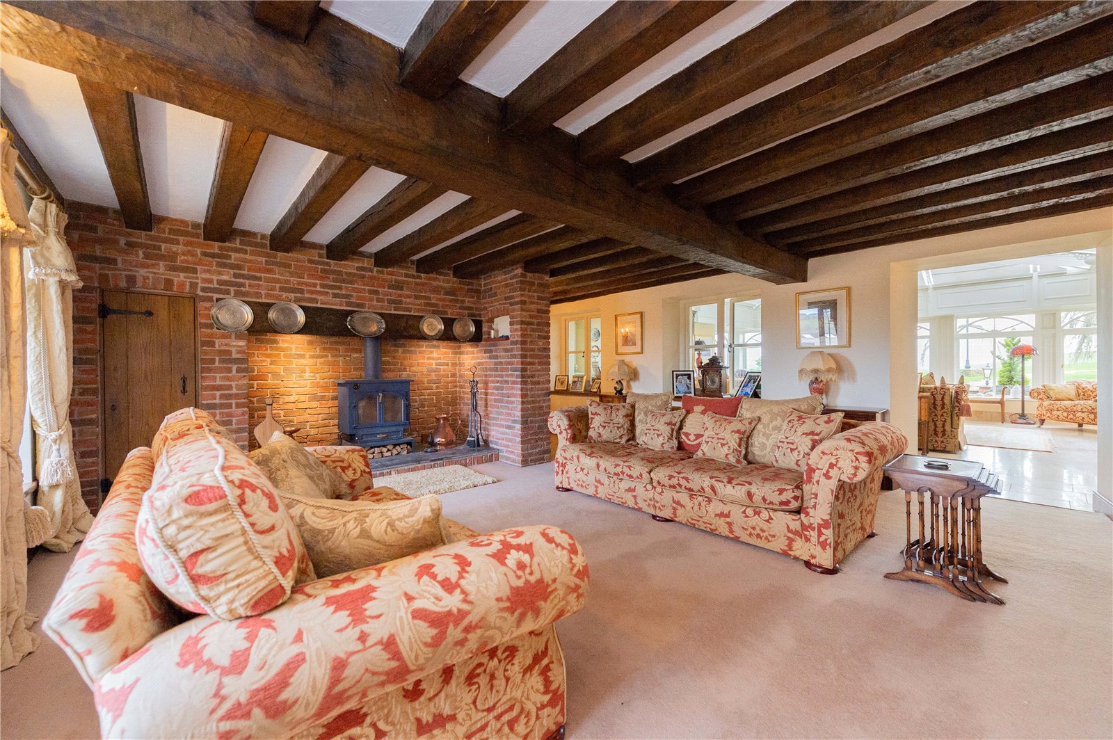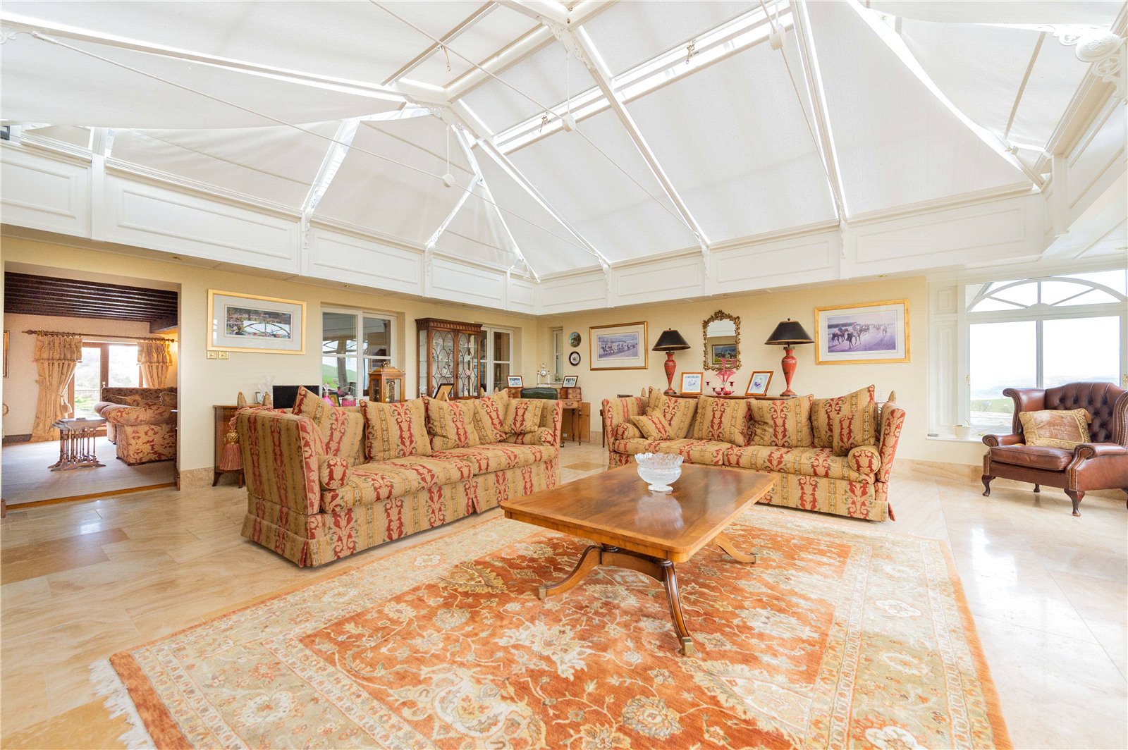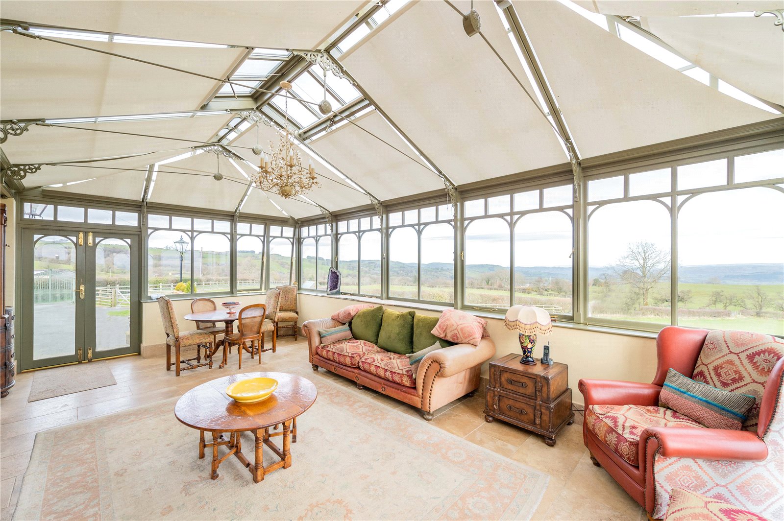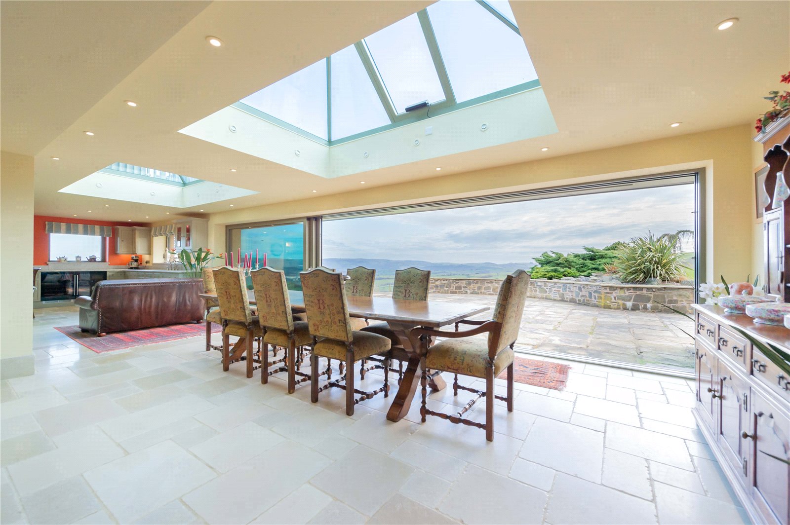 Next door is the utility room with space for the washing machine, tumble dryer and cupboards, again with a granite counter top. Further beyond is the large conservatory with exceptional views and French doors leading out to the garden.