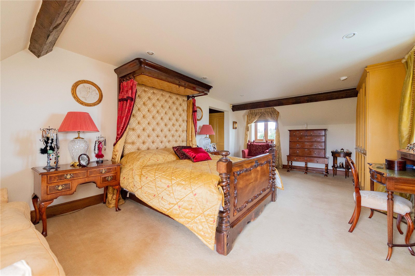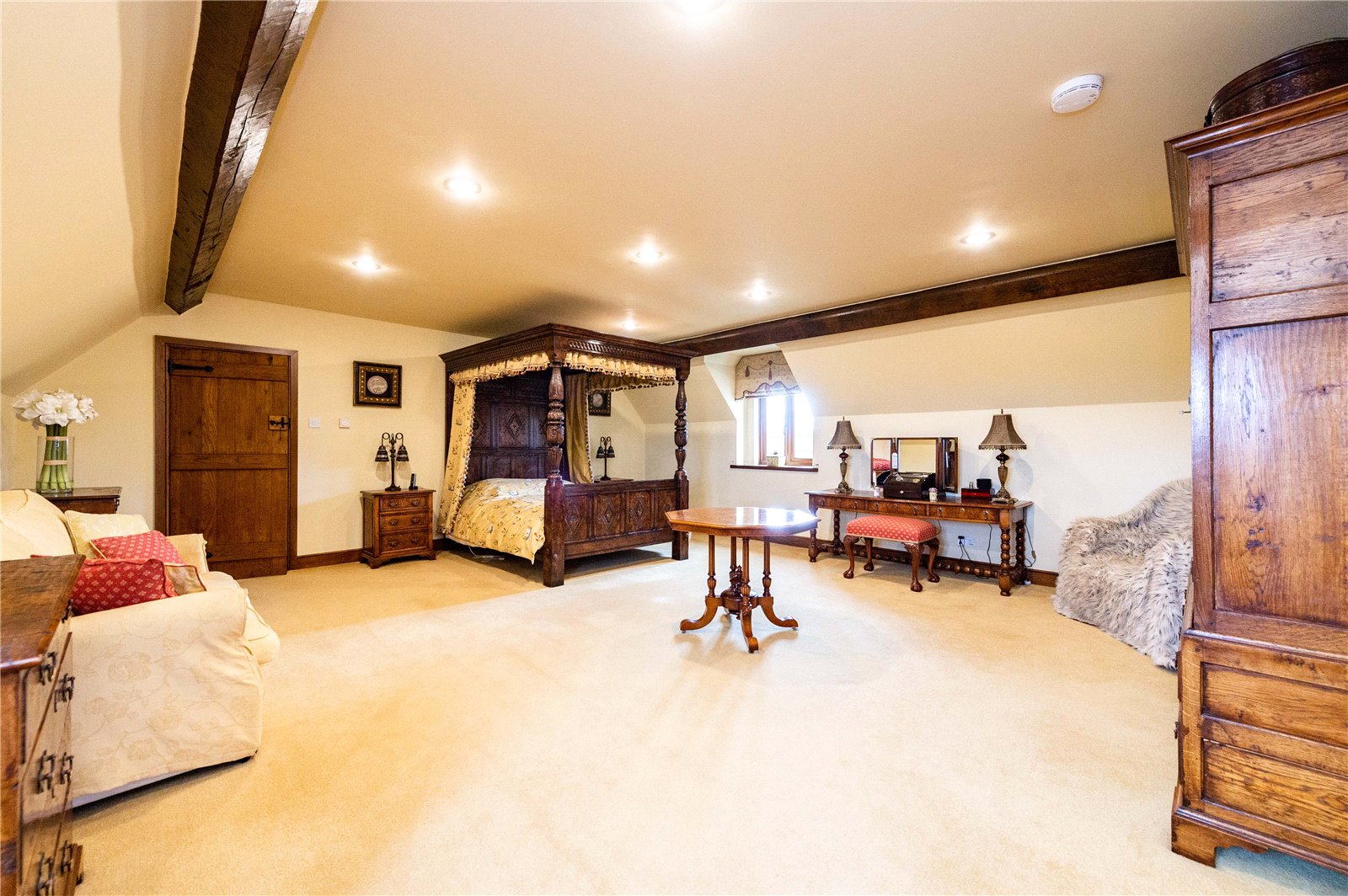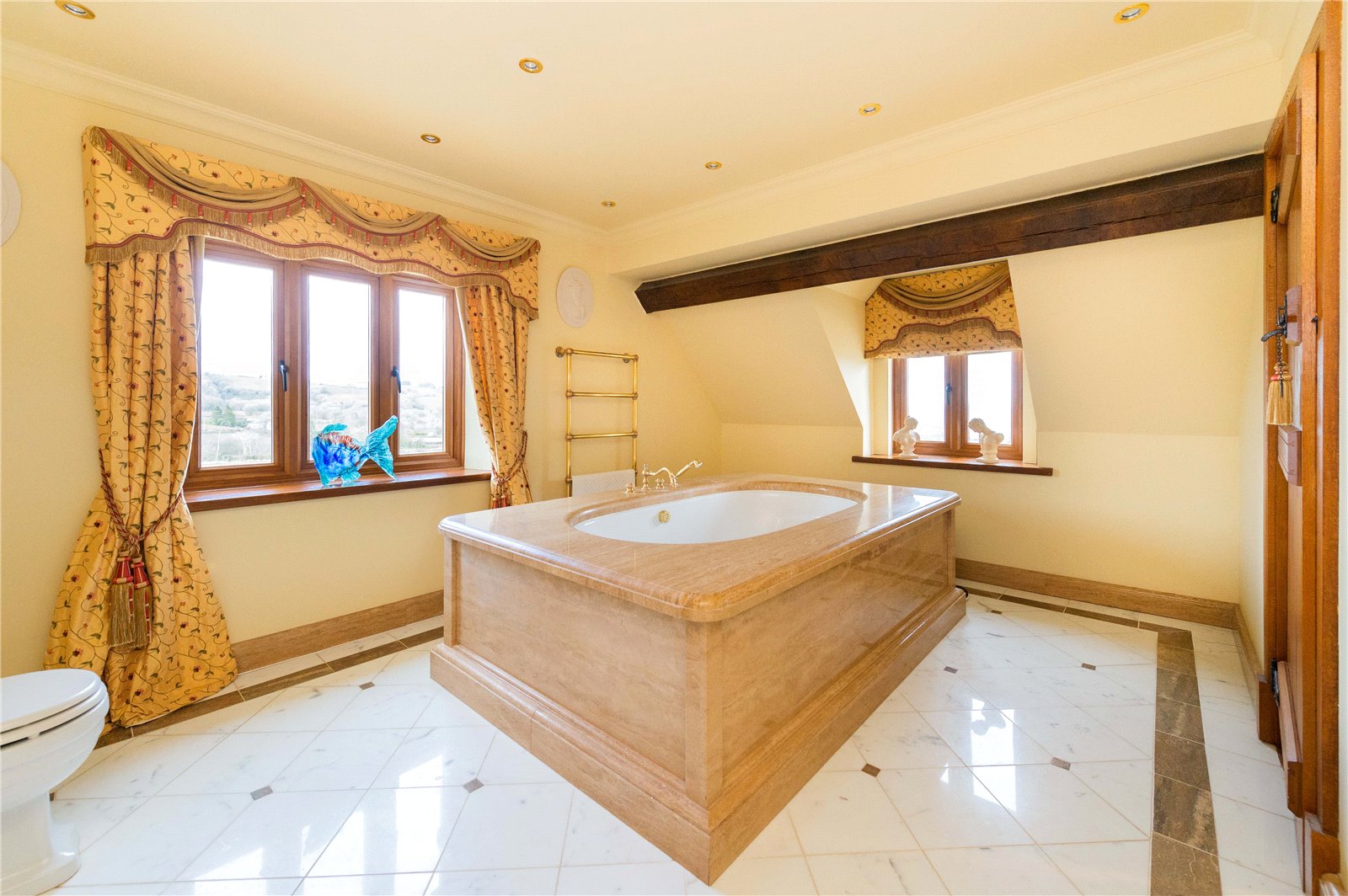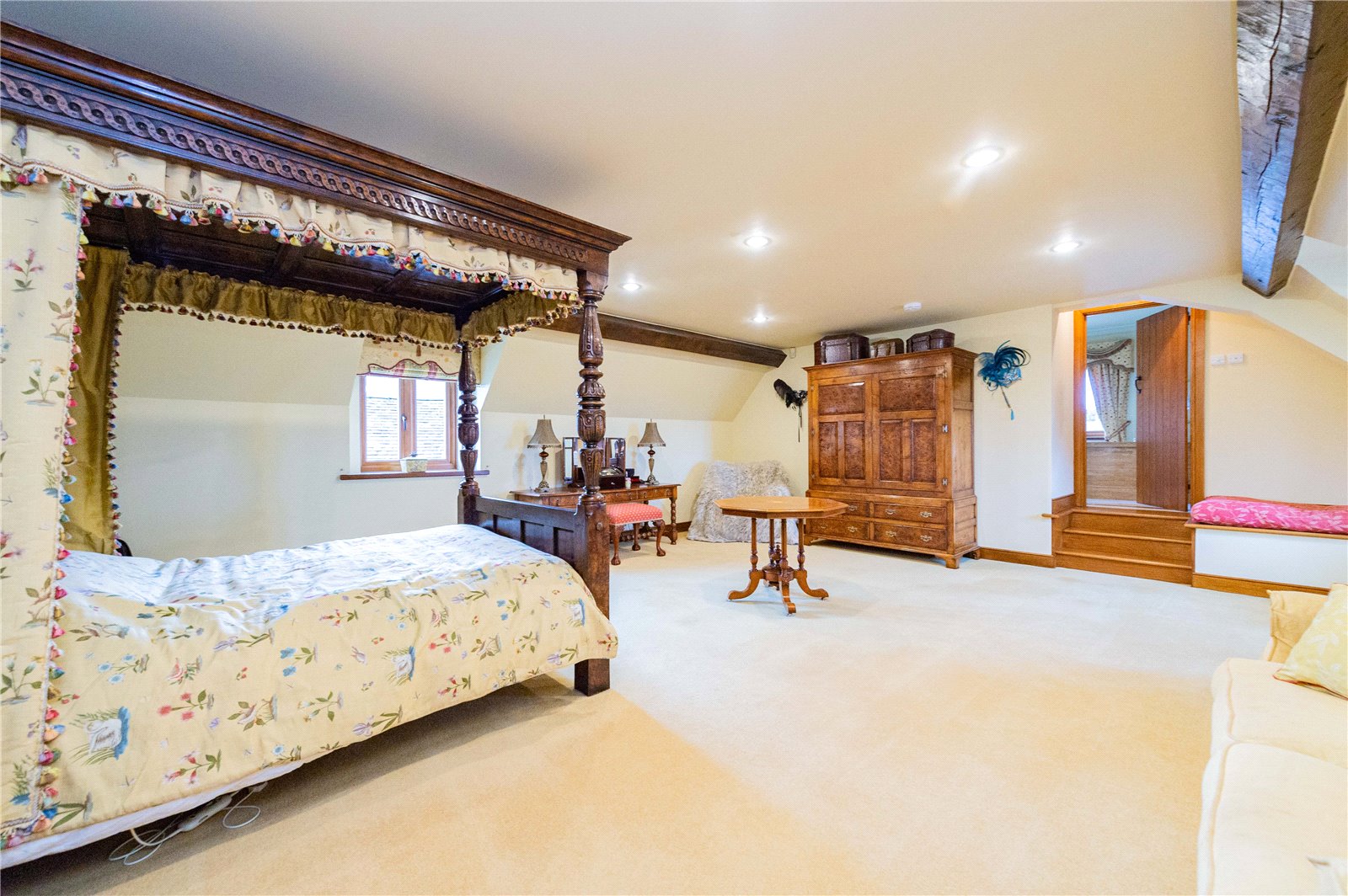 Upstairs, the property is laid out as a four bed; however, it could easily be divided further if a purchaser wished to do so. To the right is a large guest suite, set away from the other bedrooms, with a balcony providing for wonderful morning views. Along the landing, to the left, is a bedroom with its own en suite shower room, in front is a family bathroom and on either side are the fourth bedroom and the large master bedroom suite with oversized bath, double sinks and shower.