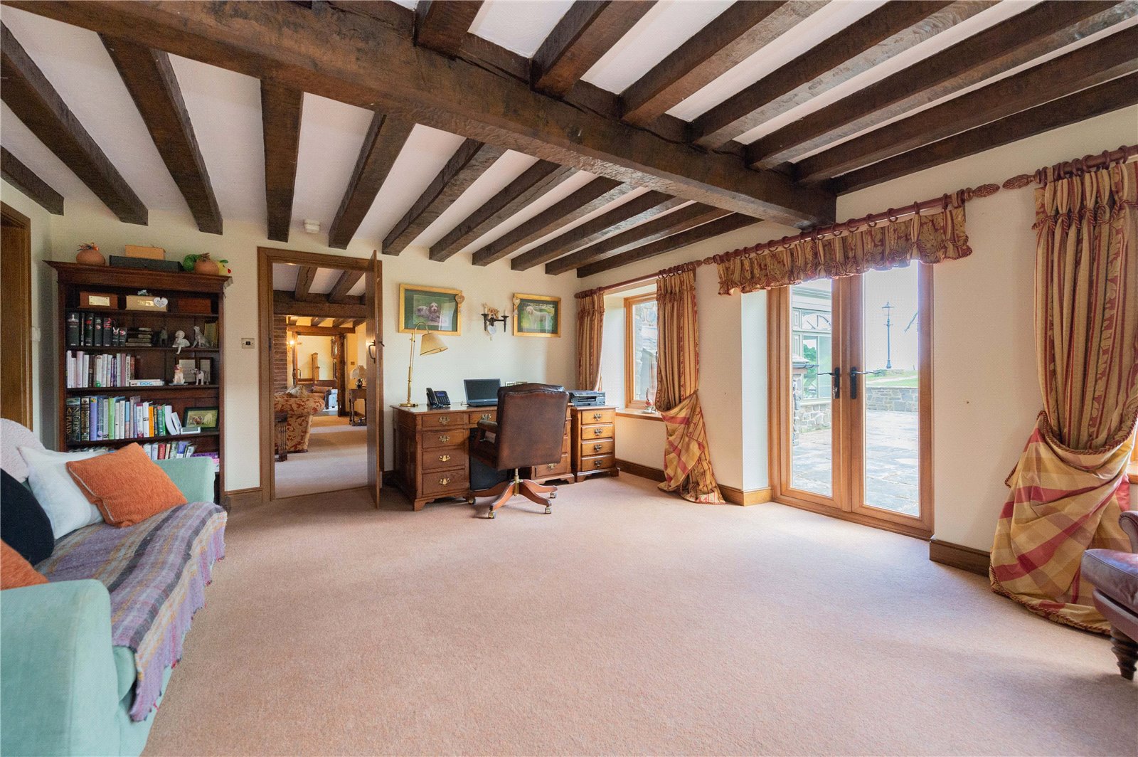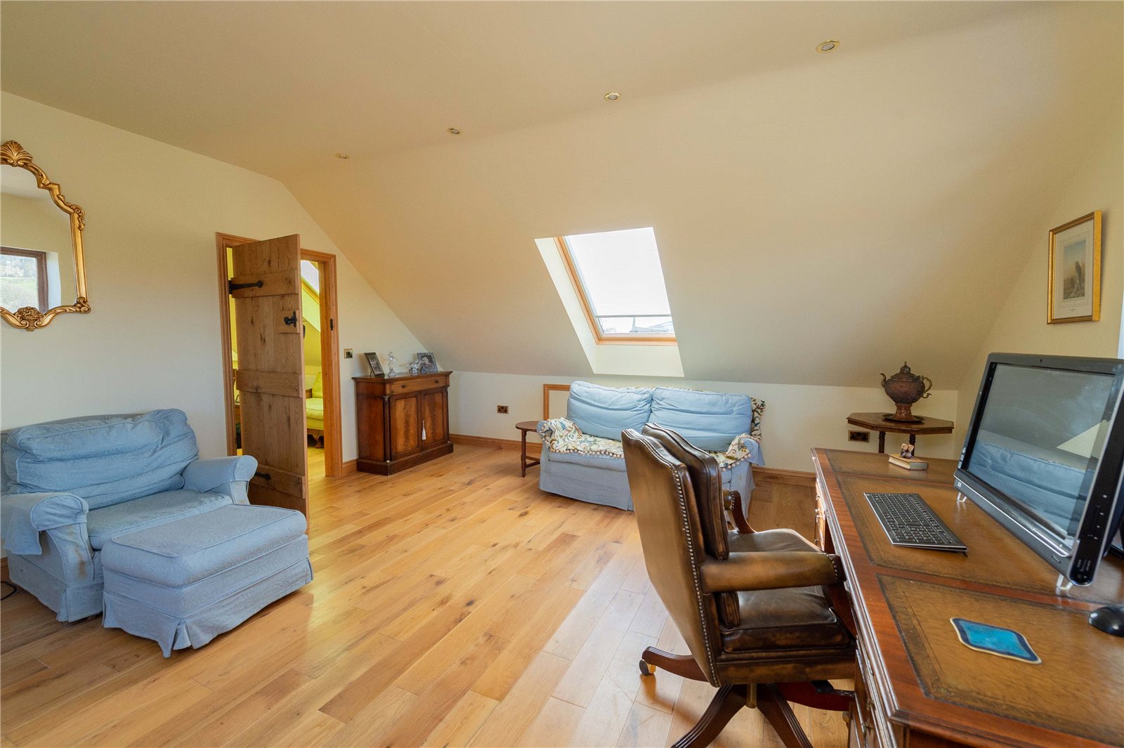 Back in the hallway, to the left is a large cloakroom accessed under the wide oak-framed stairs leading to the first floor. To the right there is the sitting room with a clever internal/external wood store next to the Clearview stove. To the left from the sitting room is the orangery/drawing room which is bright with a large central skylight and a bank of windows with double doors leading out to the south-facing terrace. Straight ahead from the sitting room is a large home office/study with Ultra-Fast Fibre Broadband providing exceptional speeds across the whole house. This leads into the boiler room, which has been partially converted into a gym, with a Jacuzzi set in front of the full length windows looking across the valley.