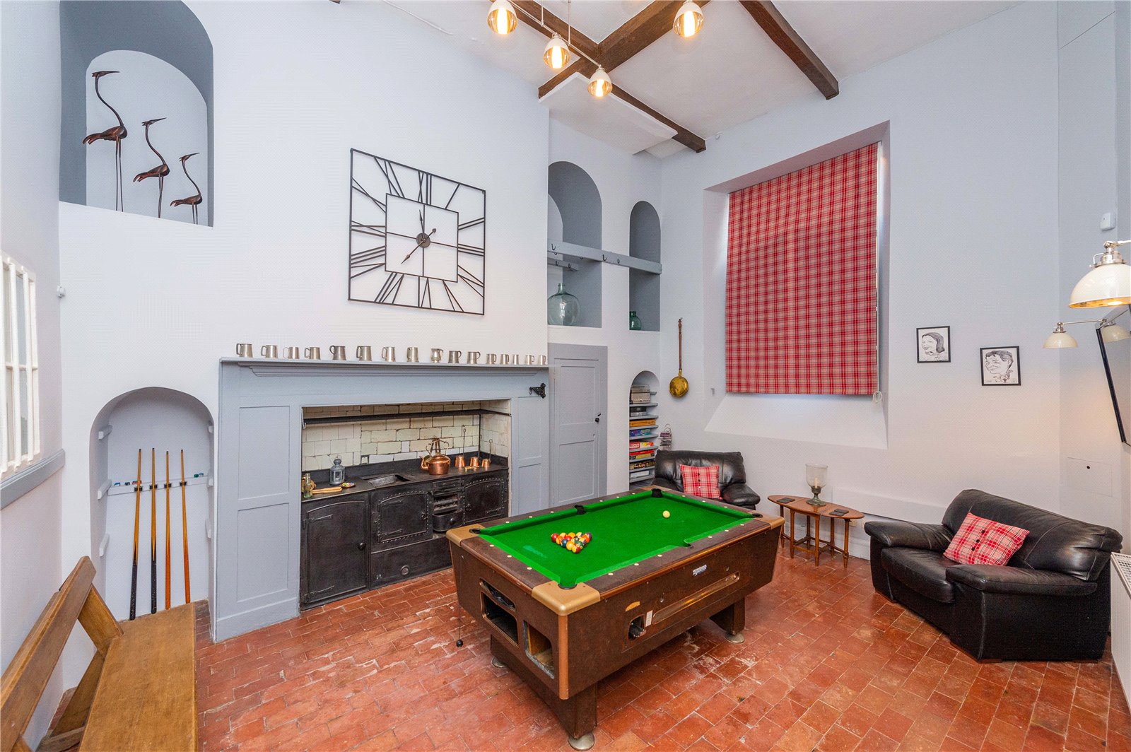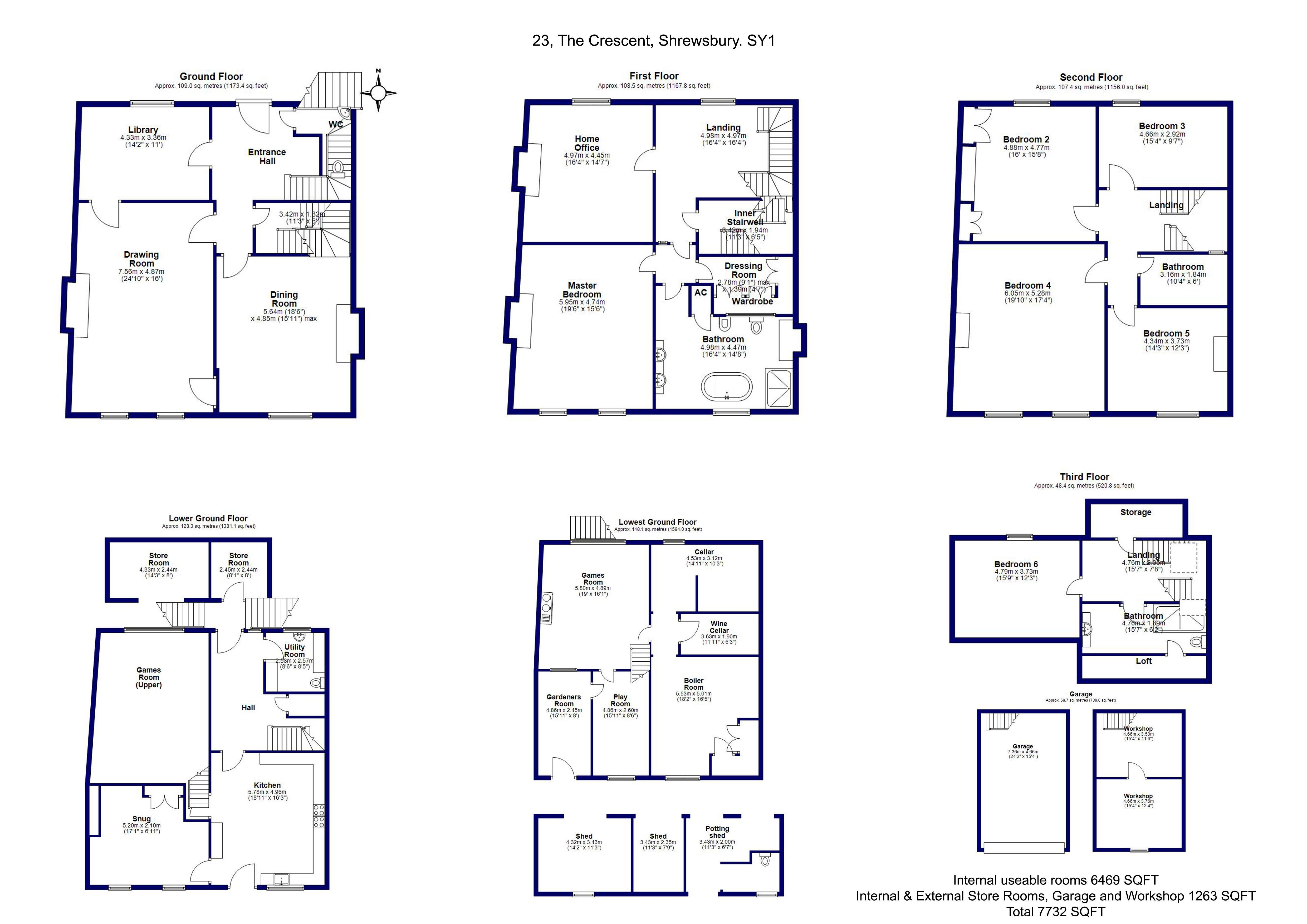 The accommodation is arranged over six separate storeys and comprises: six bedrooms, drawing room, formal dining room, kitchen / breakfast room, library, home office, snug, three bathrooms, utility, games room and various internal store rooms. Externally, front and rear, there are some vaulted storage / gardening rooms, a beautifully maintained and manicured walled and south-facing garden with parking for three cars accessed from electric gates. A large garage with workshop above is available by separate negotiation.