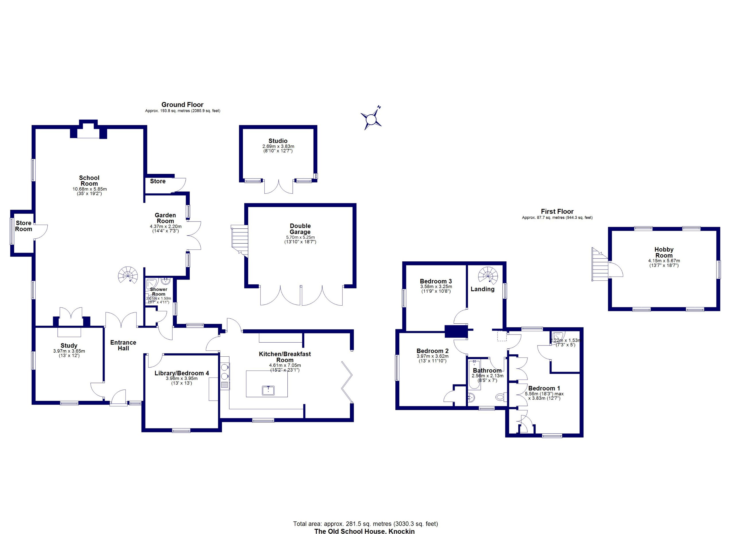 Upon entrance to the property, you have a generous entrance hall with a dual-aspect study to the left, and the Schoolroom directly ahead of you through double doors. To the right is a further hallway, on the right the Library room with built-in shelves and shower room on the left.