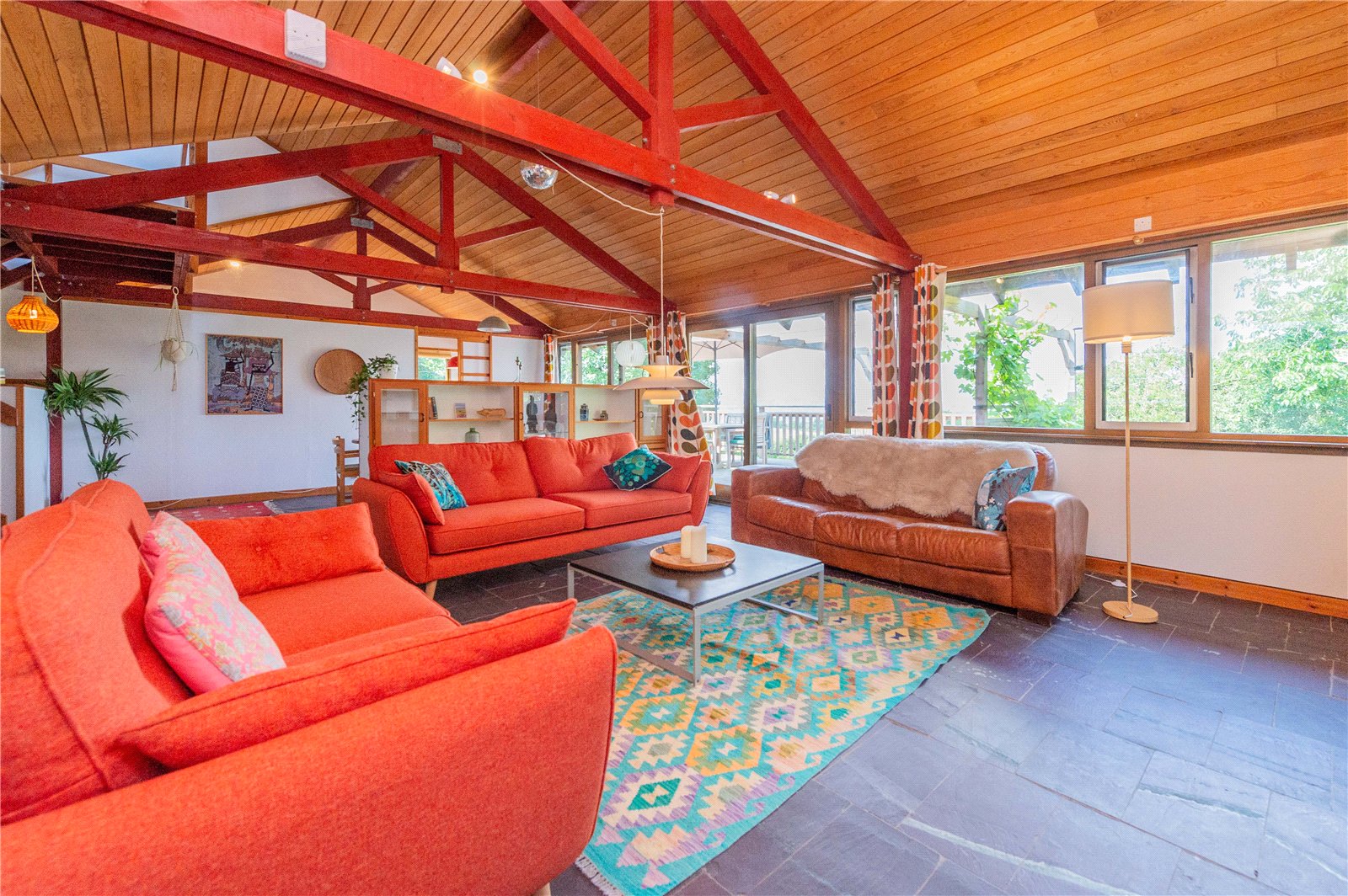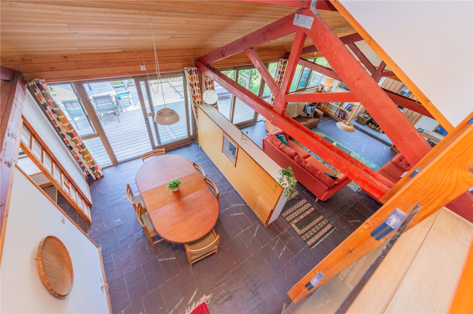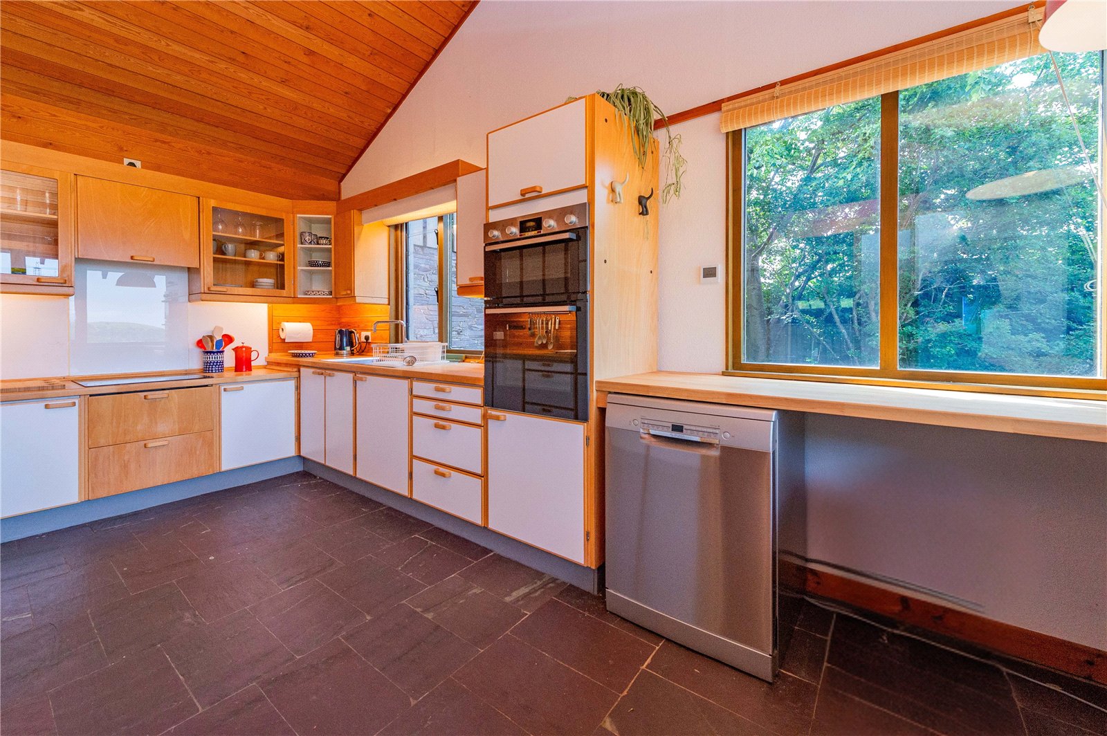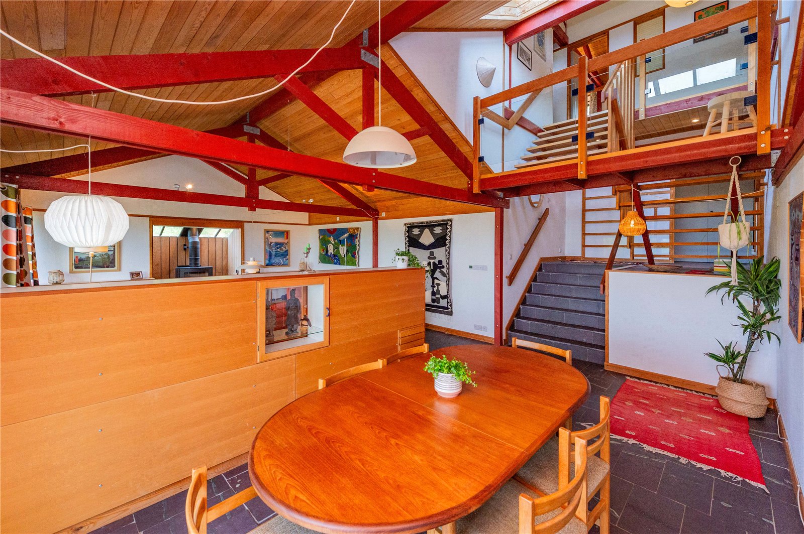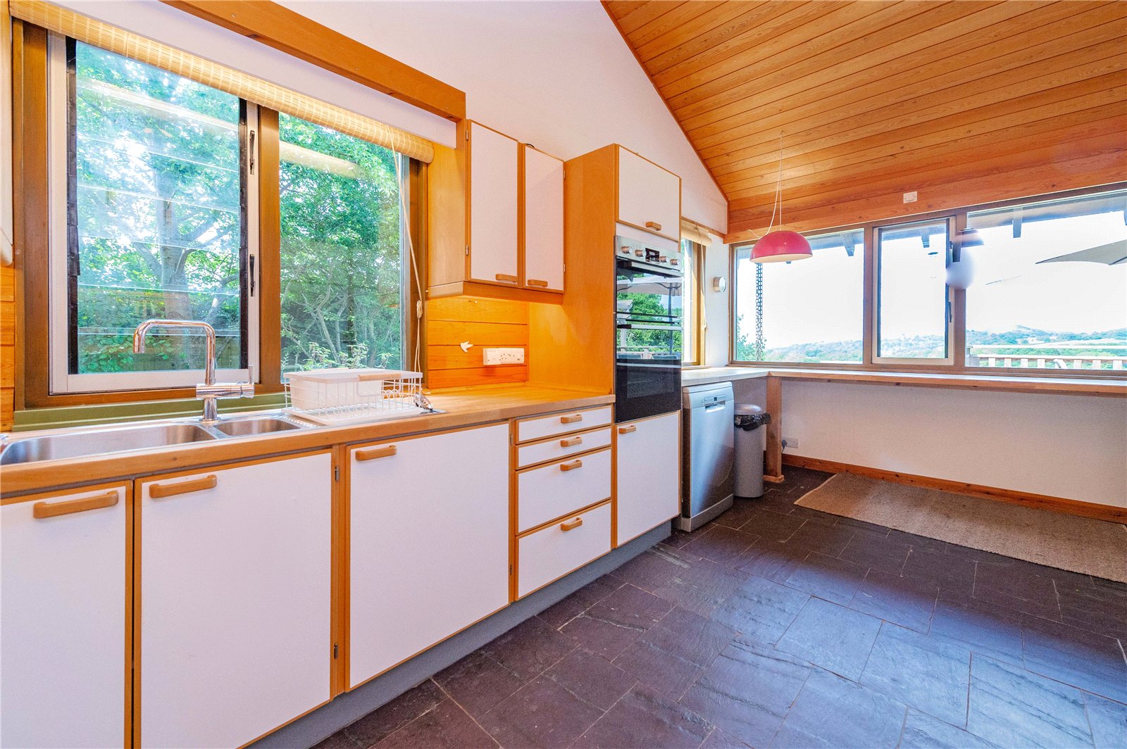 The ground floor is home to the study, WC and useful utility, with stairs leading down to the open plan living area, the heart of the house, with windows spanning the full width of the space harnessing the views. The house is split level, with the upper floor permitting a view down into the living area below. There are three generous double bedrooms, one of which is en-suite, and a separate shower room on the first floor.