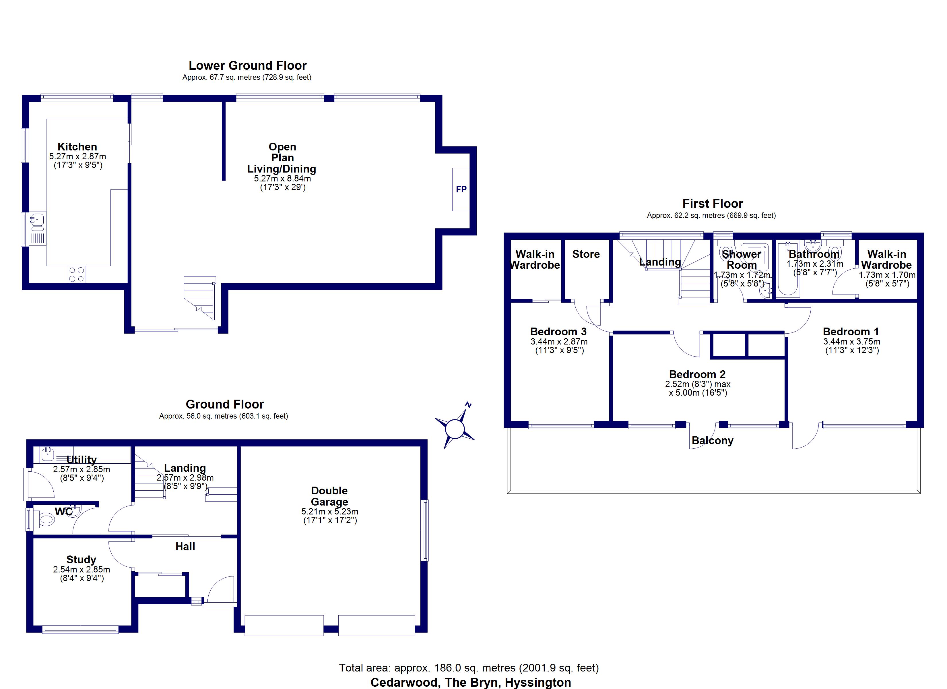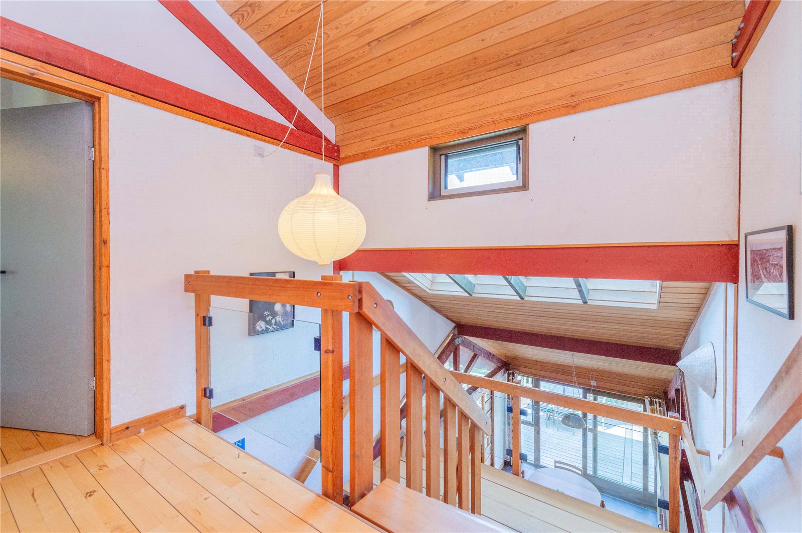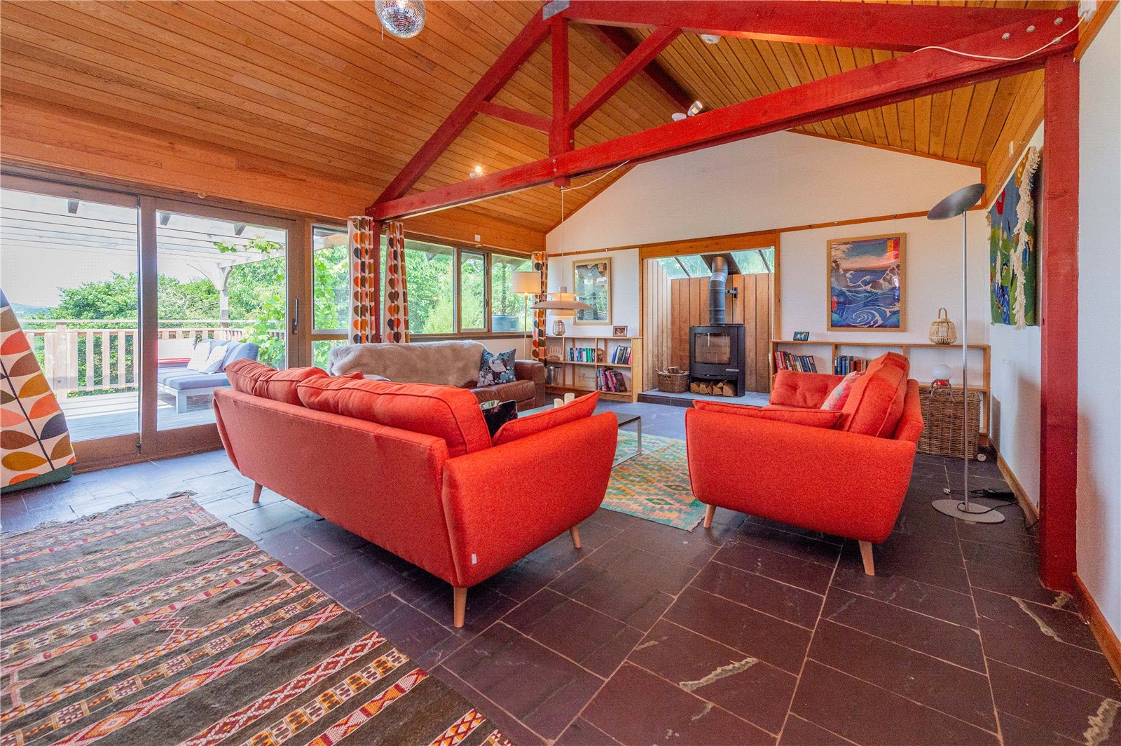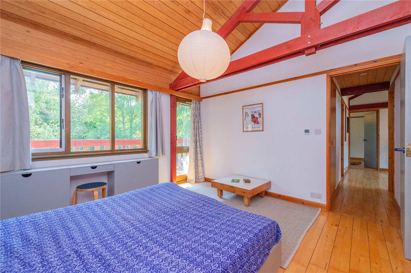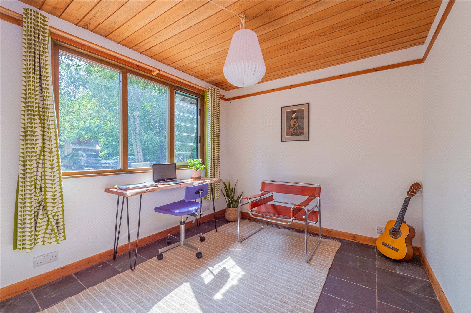 The ground floor is home to the study, WC and useful utility, with stairs leading down to the open plan living area, the heart of the house, with windows spanning the full width of the space harnessing the views. The house is split level, with the upper floor permitting a view down into the living area below. There are three generous double bedrooms, one of which is en-suite, and a separate shower room on the first floor.