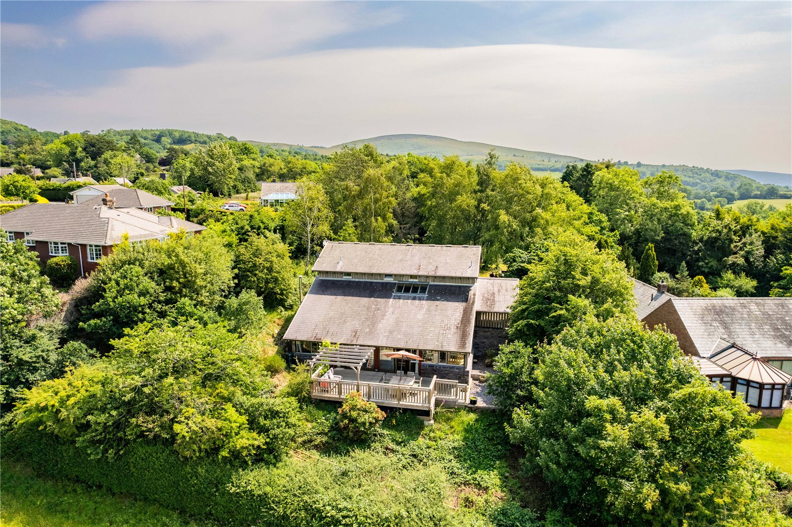 Cedarwood occupies an elevated position in the Powys countryside, boasting stunning views and a scenic setting in the village of Hyssington. Designed by Danish Architect Gert Orla Jensen, constructed over 2-3 years in the mid 1990s. It is of typical Scandinavian design, offering light and spacious open-plan living. The design also demonstrates Japanese influences, including two sliding panelled doors in the living and hallway areas.