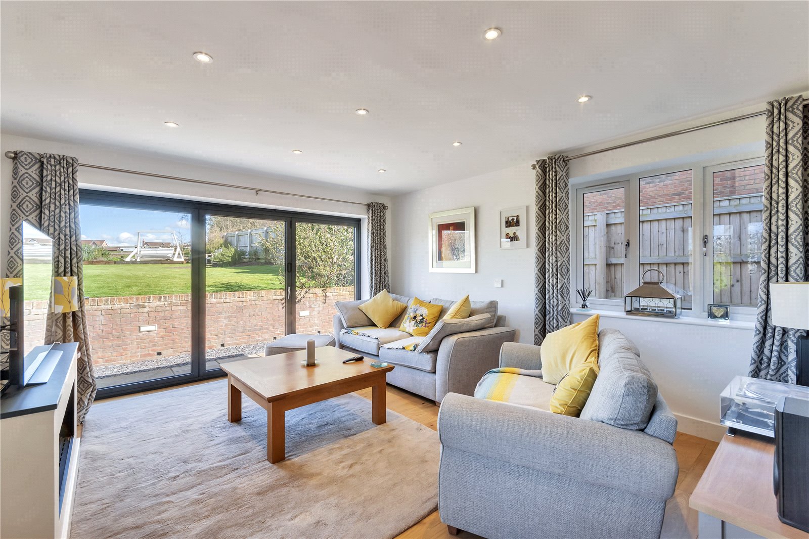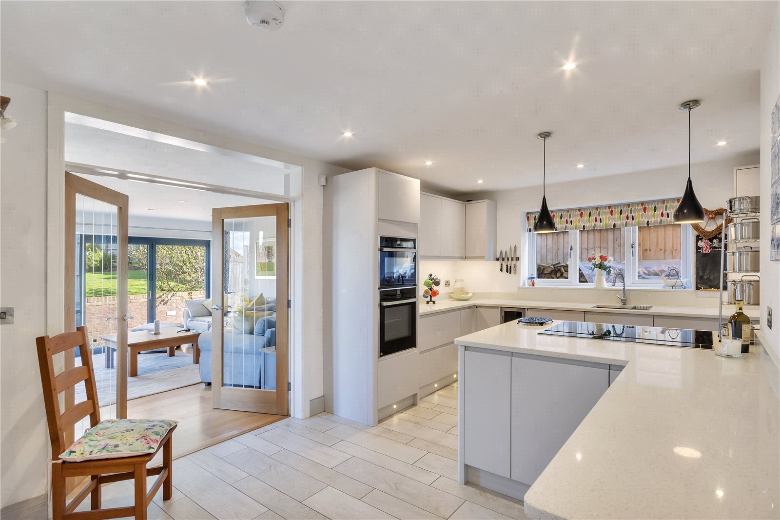 On entering the property you are greeted with a spacious entrance hall. Off the hall to the left is the sitting room with an Oak beamed fireplace featuring a log burner and French doors which lead out to the rear patio. Directly opposite the entrance door is the open-plan kitchen / dining area. There is space for a large dining table and a set of French doors boasts countryside views. The kitchen has additional seating with a breakfast bar and features a double in-built oven with separate induction hob, integrated wine cooler, dishwasher and fridge freezer. Accessed from the kitchen is the newly- built family room extension with an in-built Evonic fire and triple aspect views (including both bifold and French doors) of the rear garden and countryside.