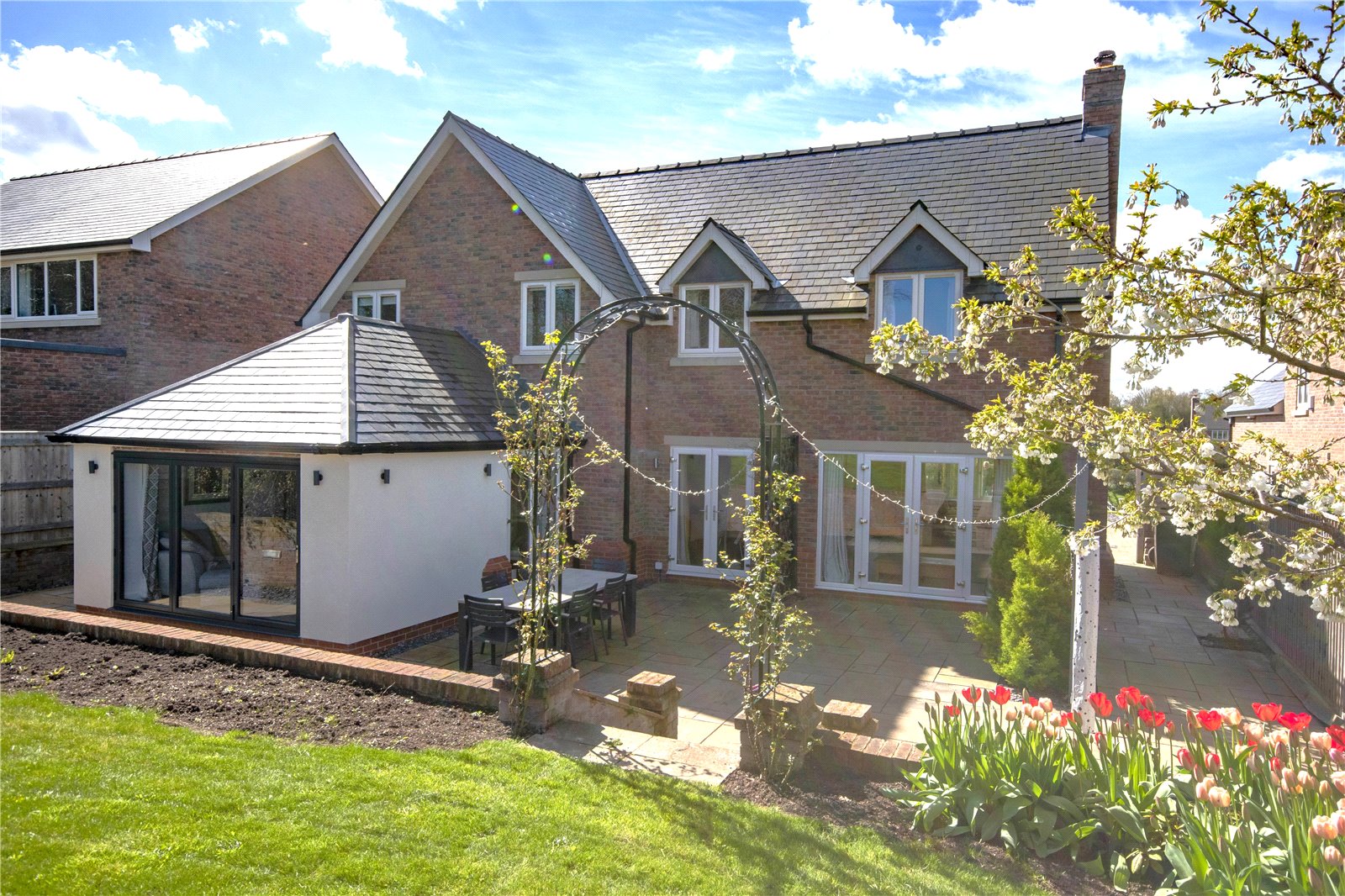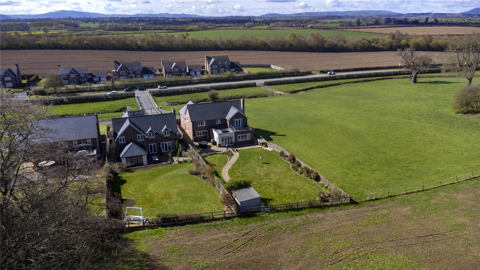 The spacious garden has far-reaching countryside views. There is a large lawned area and an entertainment patio. A further raised patio towards the rear of the garden offers views towards the rear of the property. The front garden leads down towards the shared driveway.