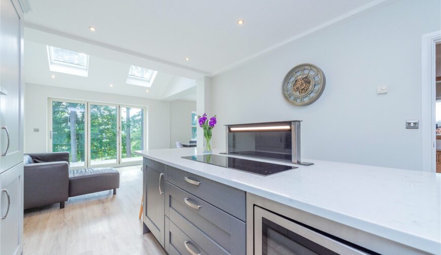 Once in the property, you are greeted by a generous hallway sitting at the heart of the home, featuring a striking oak and glass staircase. The accommodation on the ground floor consists of a spacious sitting room with direct access to the light and airy conservatory, a bespoke fitted kitchen/breakfast room which has been extended to create a fantastic family living/dining space, a useful utility room leading to the double garage and a w/c.