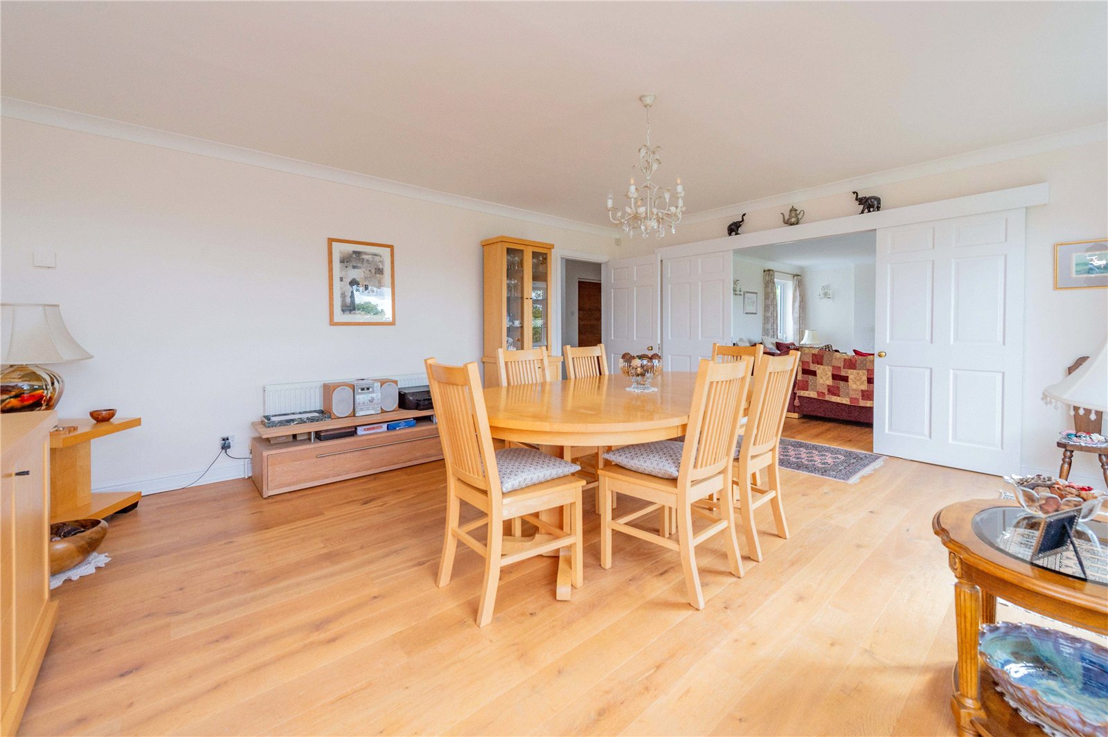 As you step through the front door, you are welcomed by a spacious hall with a cloakroom and a polished oak floor that seamlessly flows into the reception rooms. The drawing room radiates elegance, featuring a lovely fireplace and deep windows that frame the breath-taking views, complete with inviting window seats. Double doors lead you into the adjoining dining room, another fabulous space that opens up to the garden through attractive sliding doors.