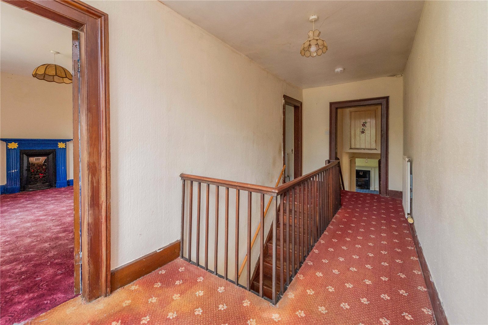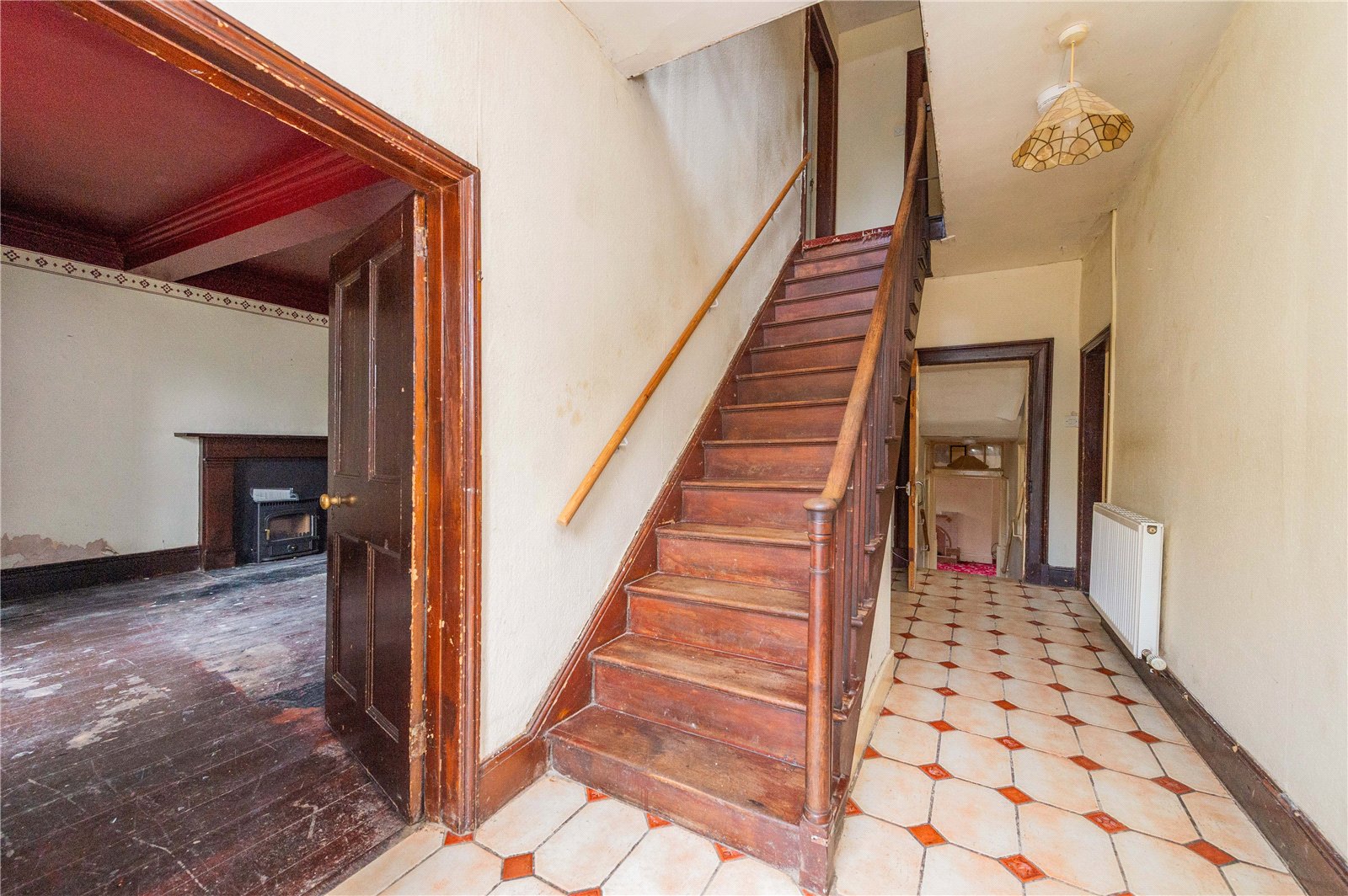 The property is accessed via a private driveway and entered through a covered porch into a generous entrance hallway, which features a central staircase and sets the tone for the well-proportioned accommodation throughout.