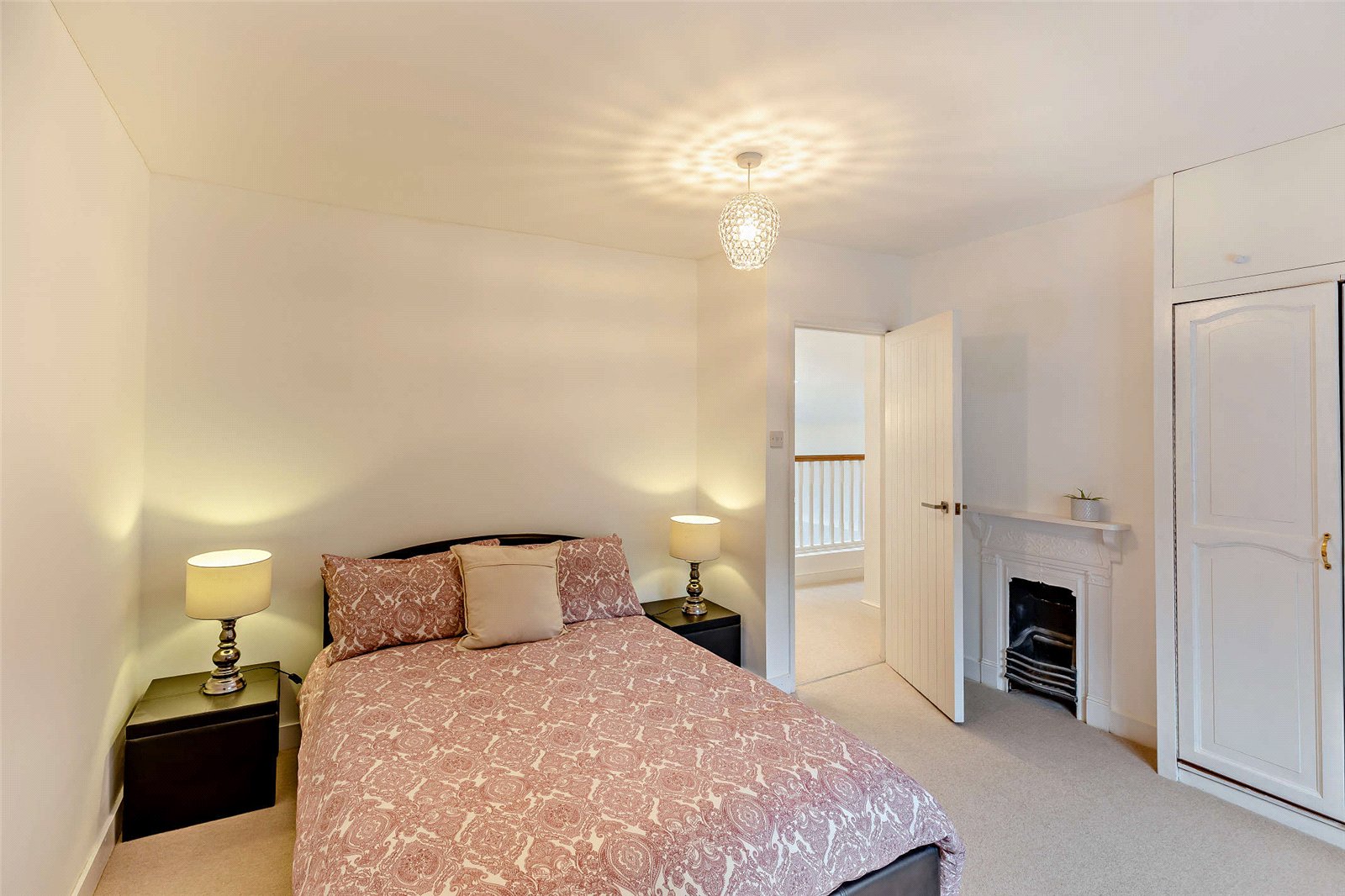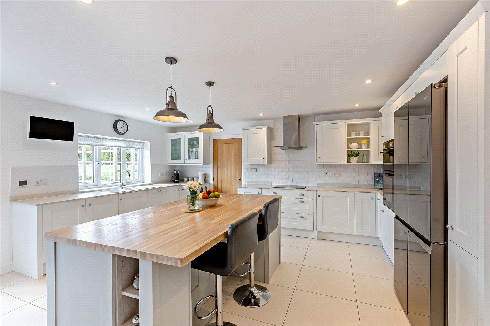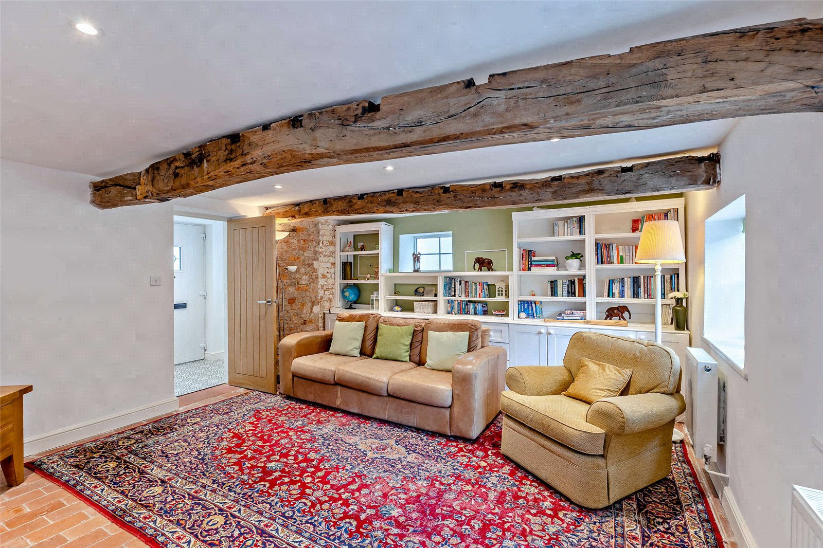 One of many highlights is the spacious family room, which features elegant bi-folding doors that open to reveal the stunning rear gardens—perfect for entertaining or relaxing with family. Off the family room is a delightful study with dual aspect views over the garden, a range of fitted book shelving and storage cupboards. The dining room is an elegant space with beamed ceilings, a characterful brick feature fireplace and chic French doors with views to the property’s orchard.
