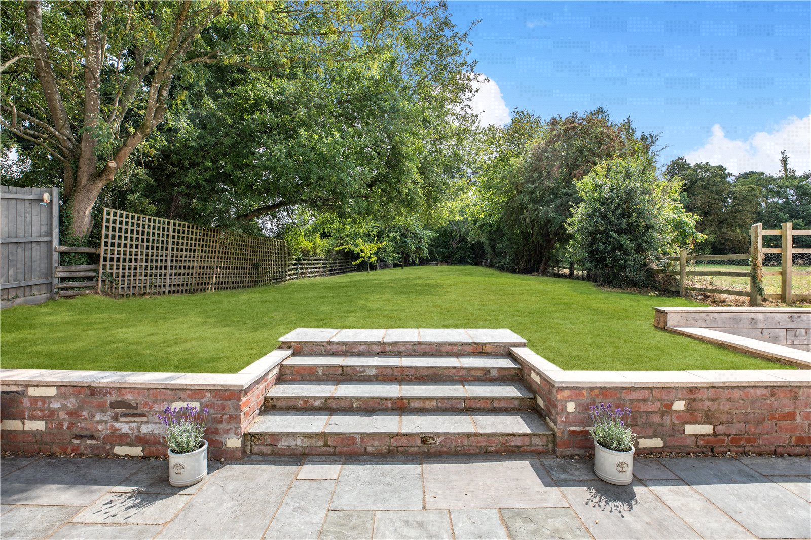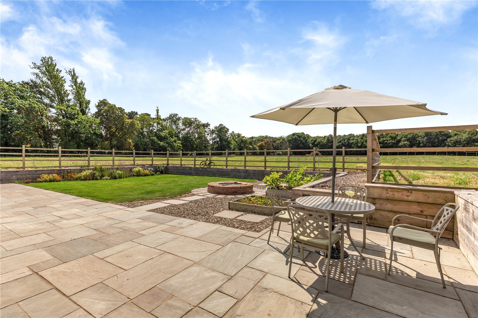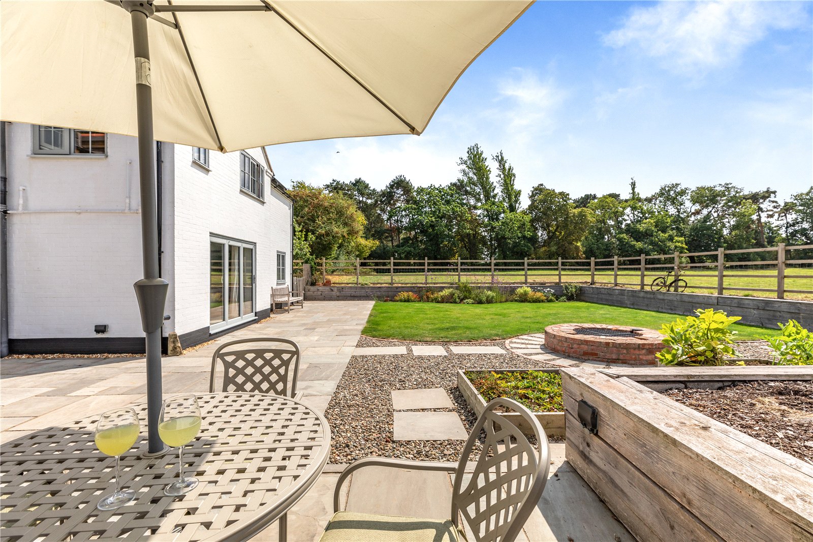 The gardens are a true gem, benefiting from a desirable south-westerly aspect, having been immaculately landscaped and designed for outdoor enjoyment, taking full advantage of the picturesque views over open fields. The extensive flagged sun terrace is an ideal area for al fresco dining and relaxing in the sunshine. Beyond this, delightful raised lawns are bordered by flower beds, perfect for herbaceous plants and shrubs.