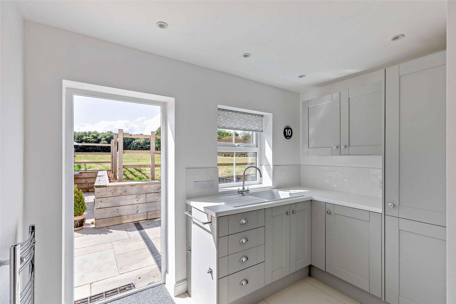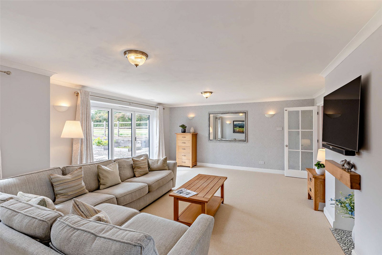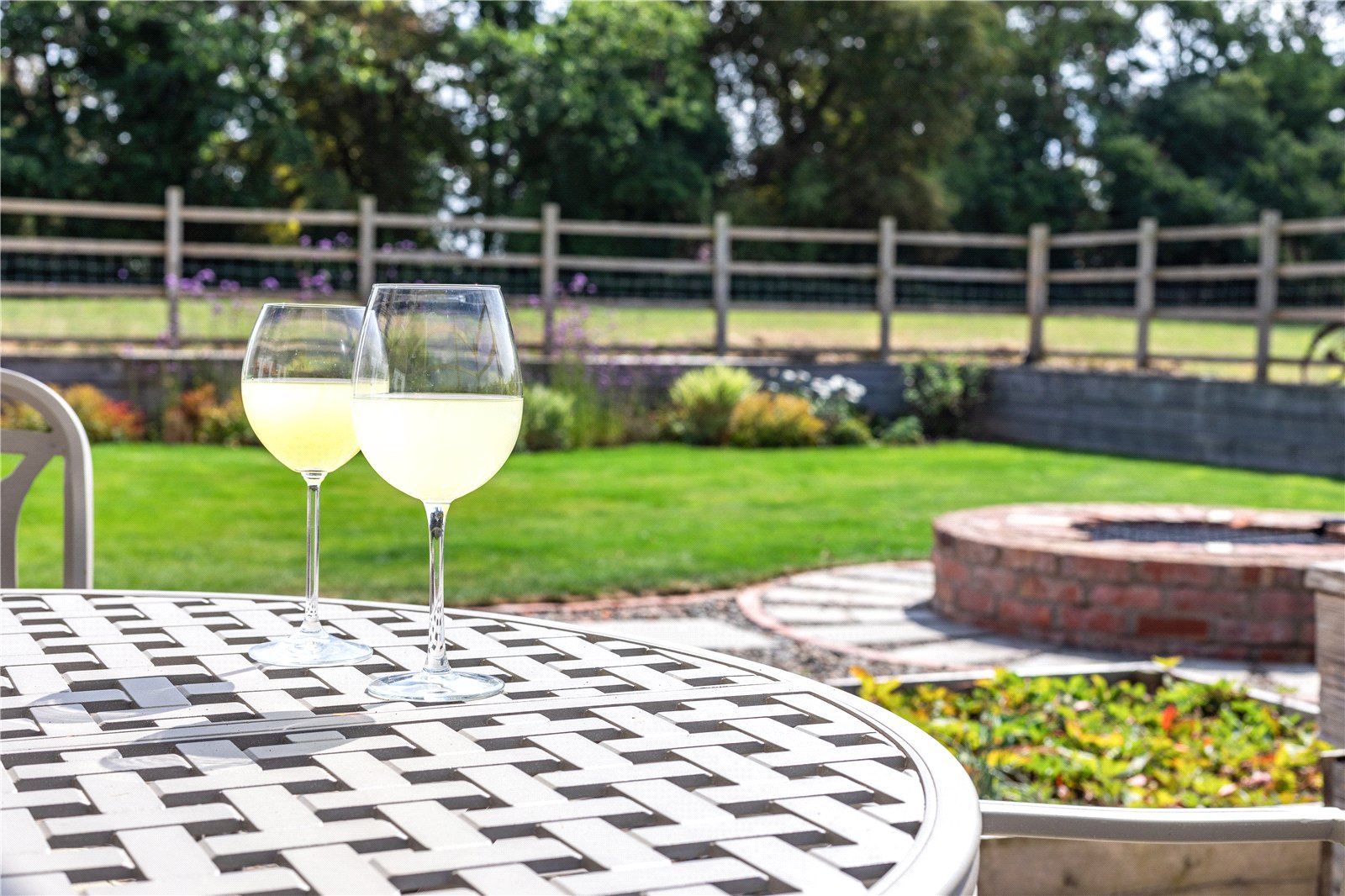 The gardens are a true gem, benefiting from a desirable south-westerly aspect, having been immaculately landscaped and designed for outdoor enjoyment, taking full advantage of the picturesque views over open fields. The extensive flagged sun terrace is an ideal area for al fresco dining and relaxing in the sunshine. Beyond this, delightful raised lawns are bordered by flower beds, perfect for herbaceous plants and shrubs.