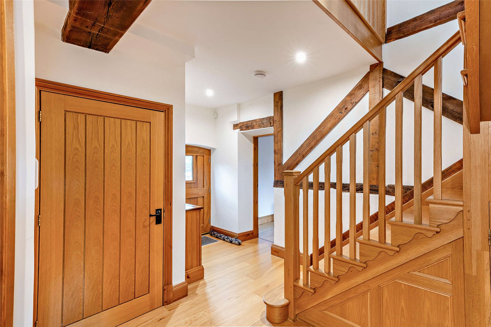 The Barley House is immaculately presented throughout decorated with a sophisticated colour pallet making it the perfect turnkey family home. The spacious accommodation includes an impressive entrance hall with bespoke oak stairs, spacious double aspect living room with inglenook fireplace with gas fire and exposed beams. The kitchen boasts oak base and wall units, granite worktops, integrated appliances and space for an everyday dining table. Off the kitchen is a wonderful light filled entertaining room and a useful utility room with matching units. The formal dining room is a lovely space flooded with natural light and an exposed beam, in addition, the ground floor also offers a downstairs cloakroom.