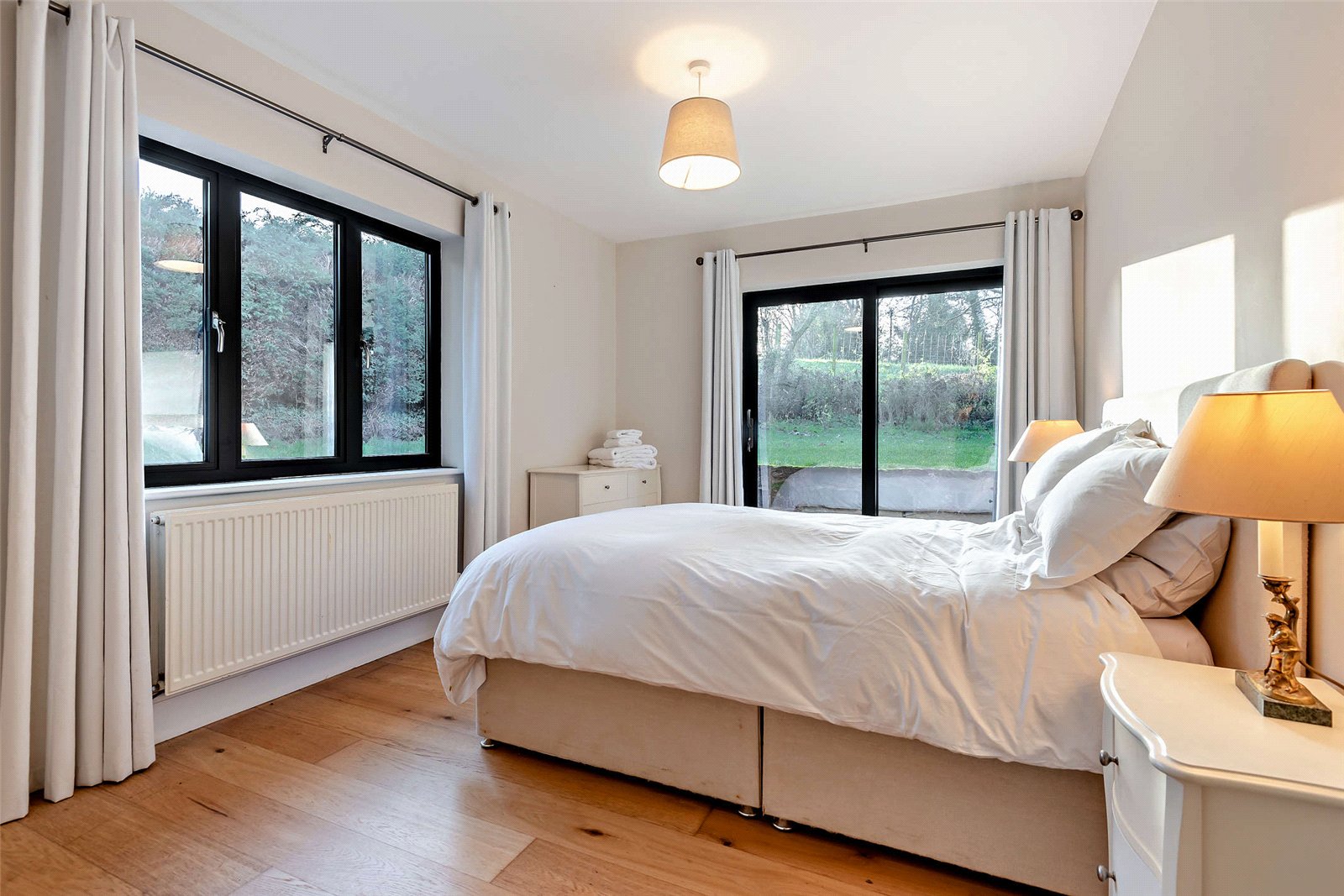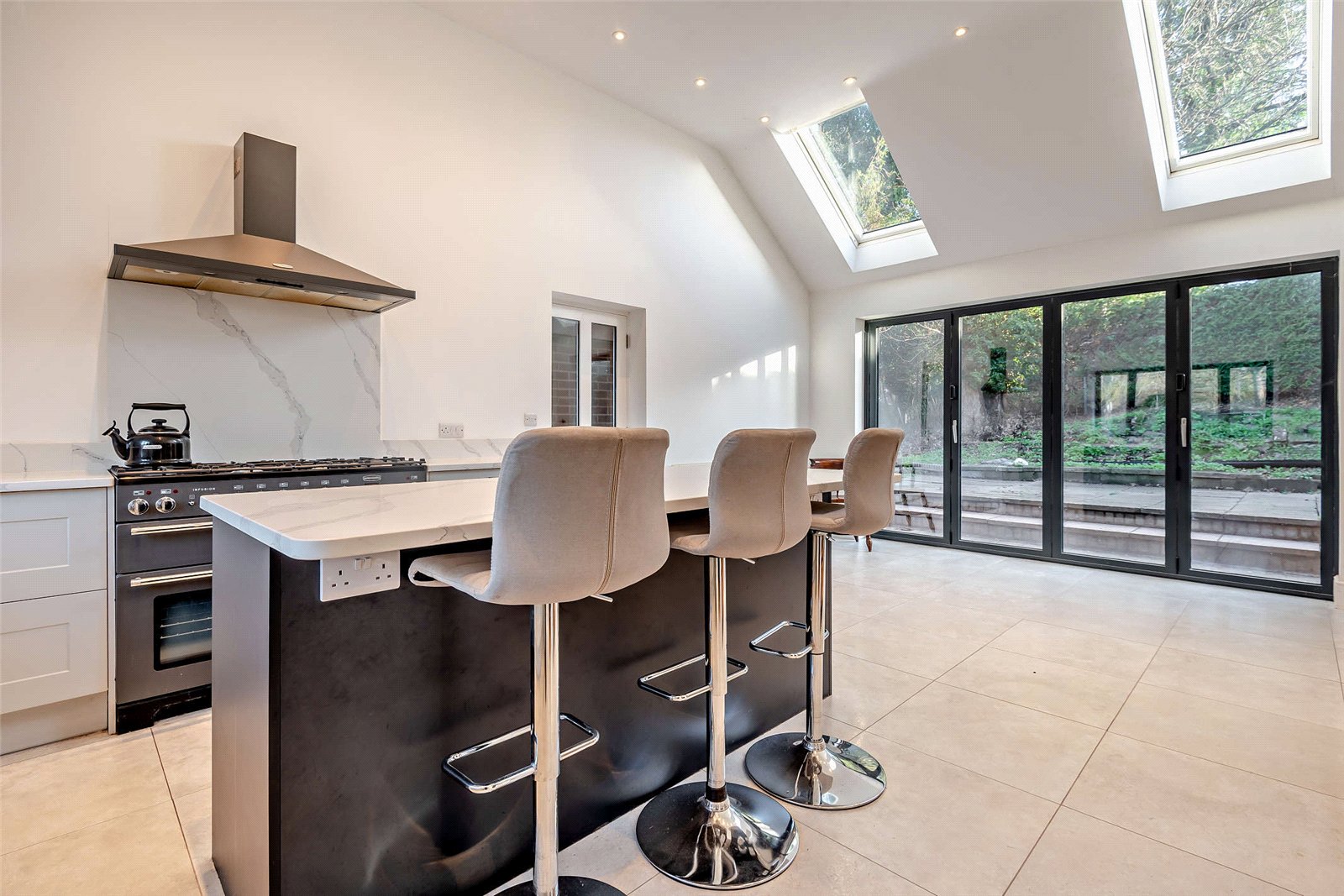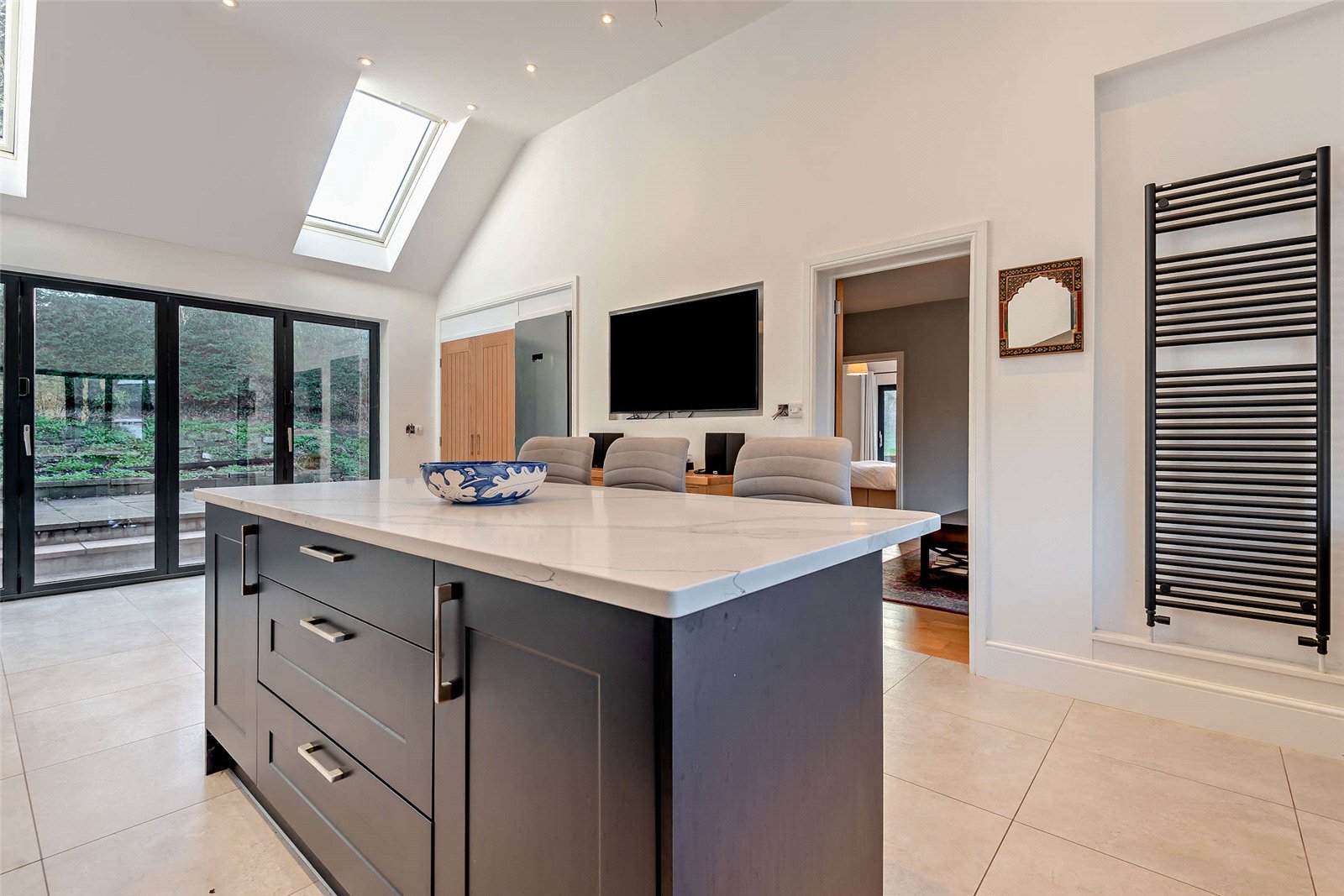 The open-plan, 22ft kitchen and breakfast room serves as the heart of the home, featuring tiled flooring, a vaulted ceiling, recessed LED lighting, skylights, and bi-fold doors that open to the gardens. This design creates a spacious and light-filled area ideal for entertaining.