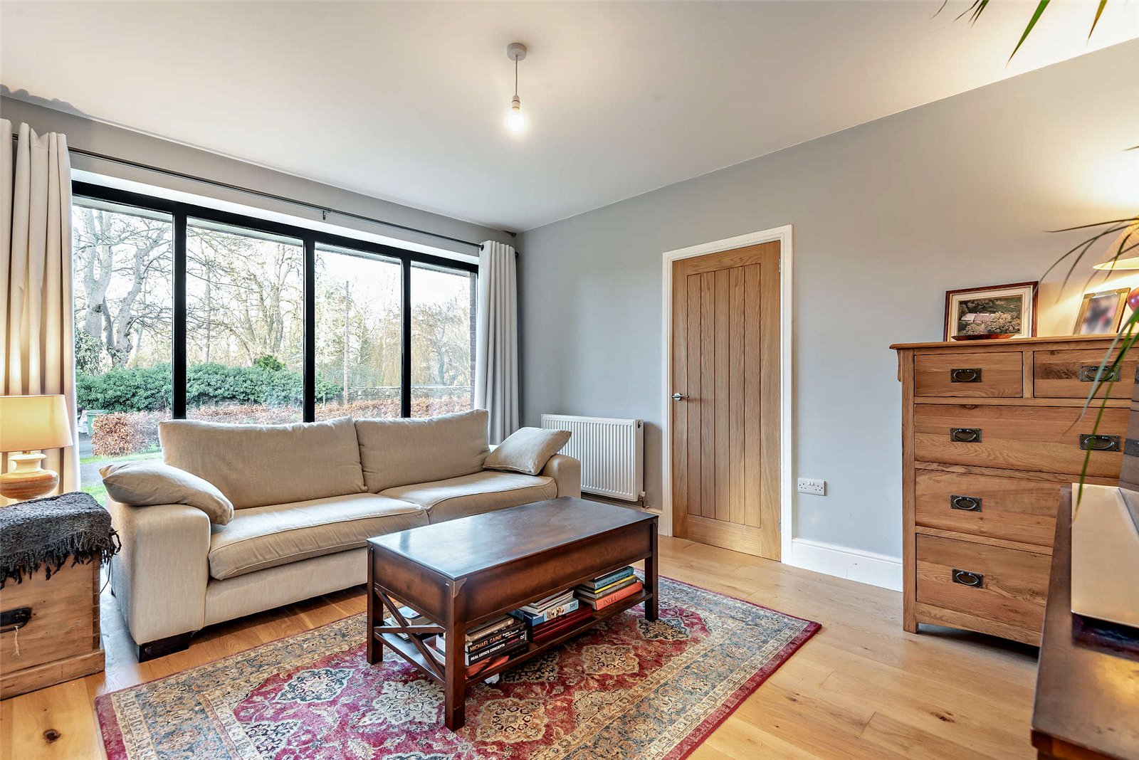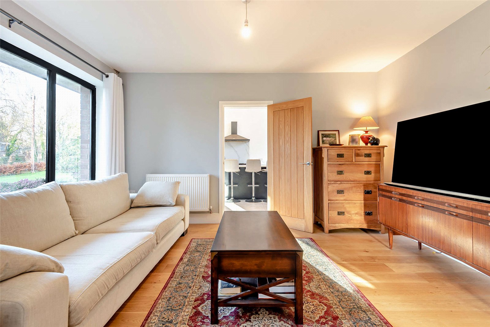 The living room, next to the kitchen, offers a serene space for relaxation with wooden floors and a west-facing window that lets in plenty of sunlight. Doors lead to two double bedrooms and a family bathroom. Both bedrooms have wooden flooring; the main bedroom