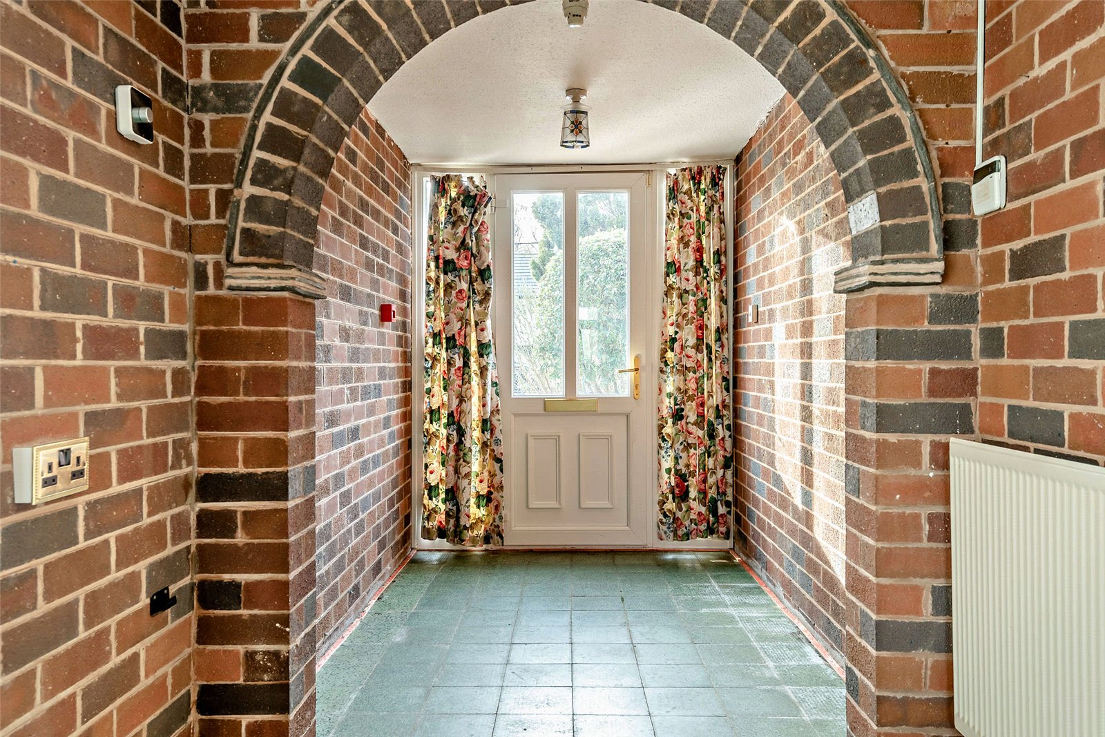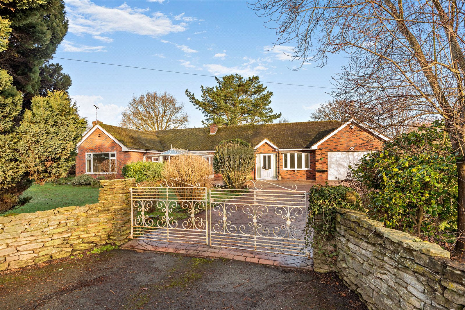 At the entrance to the property, gates open onto the block-paved driveway, which provides parking space for several vehicles, as well as access to the integrated garage.