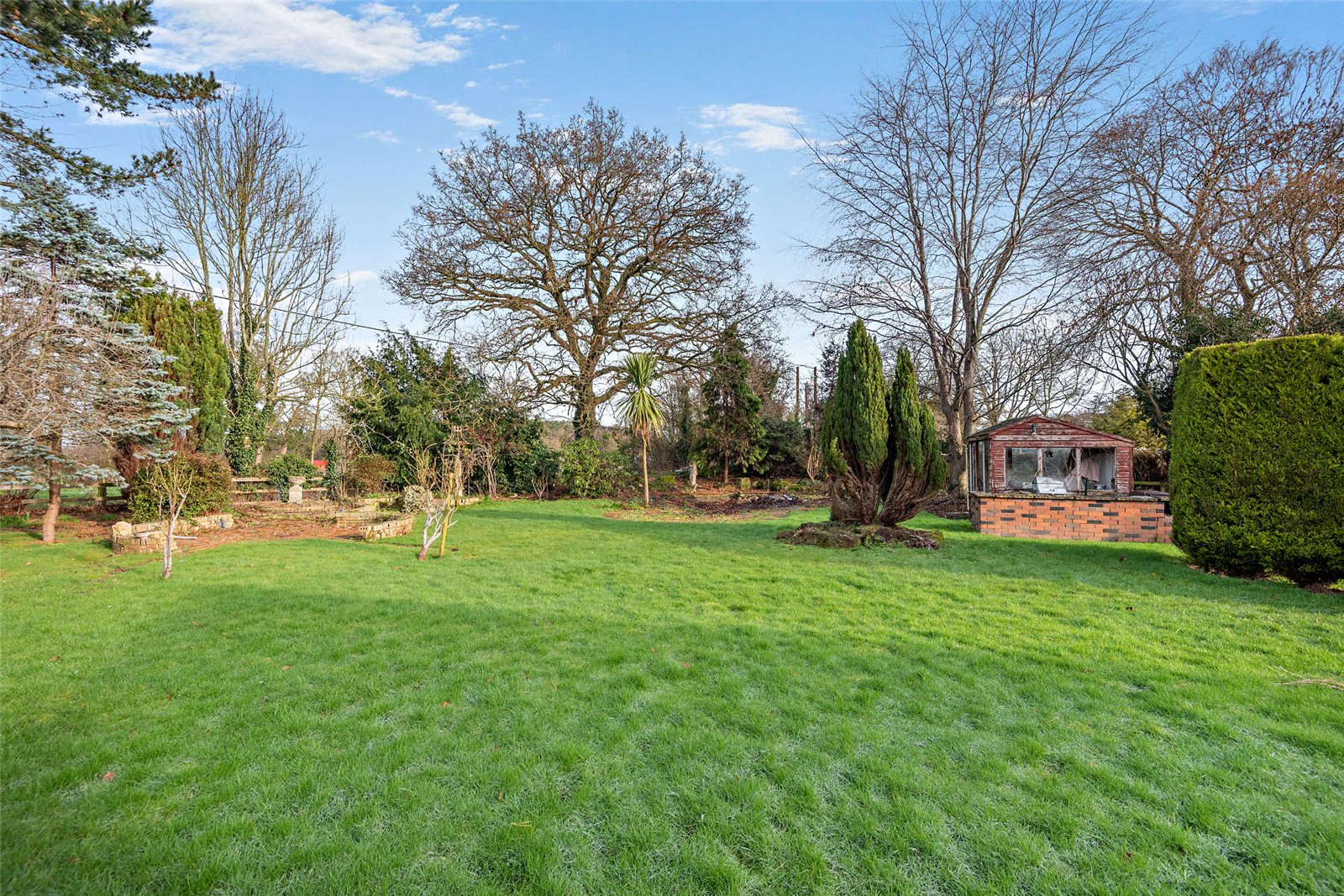 The front gardens are south-facing and lined by mature specimen trees, and provide areas of lawn to either side of the driveway, with various established shrubs and hedgerows.
