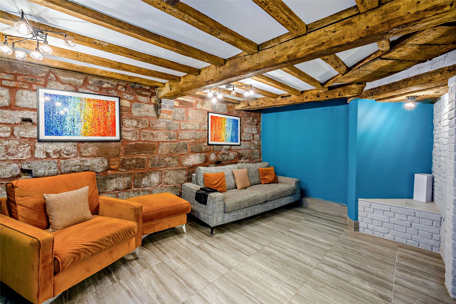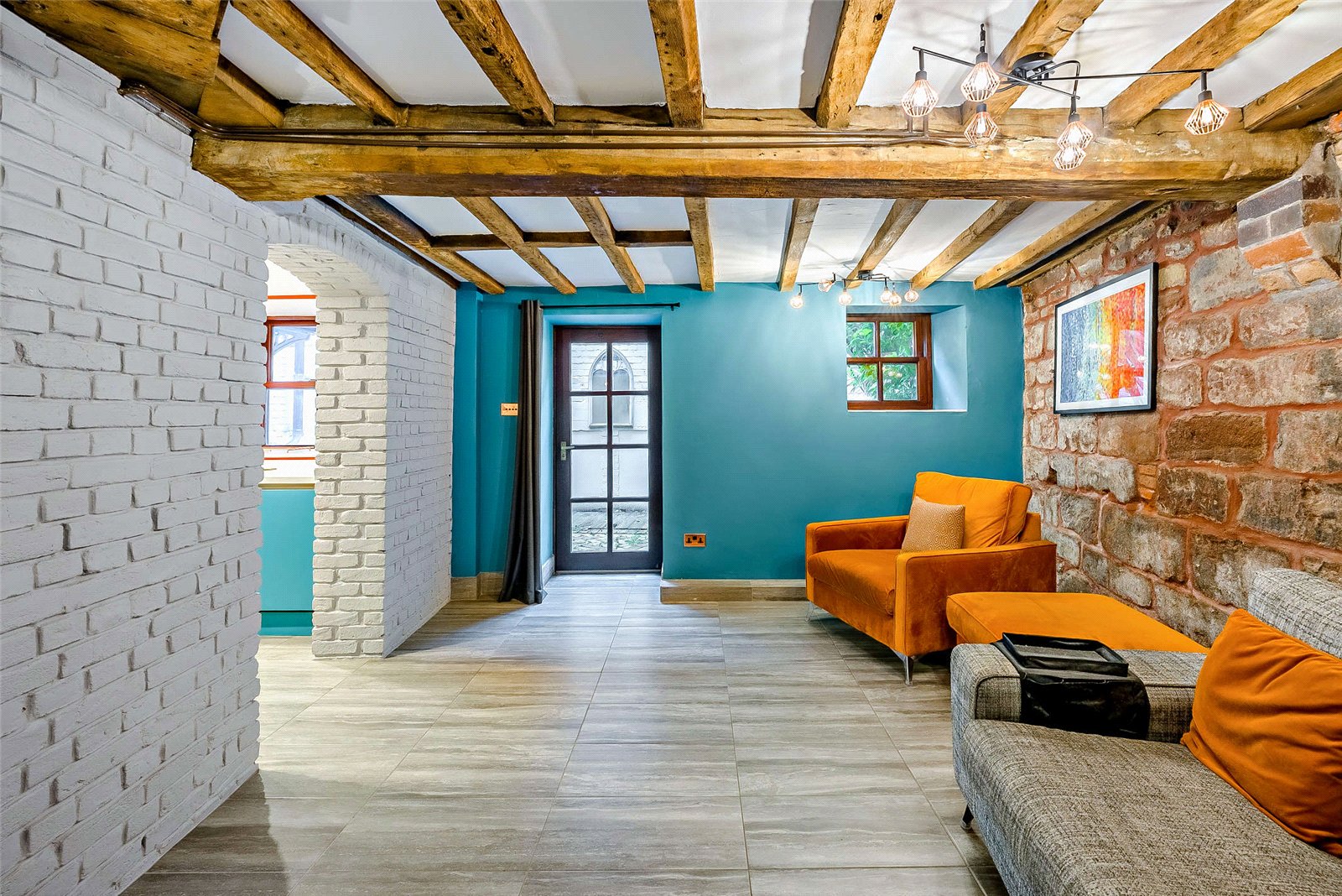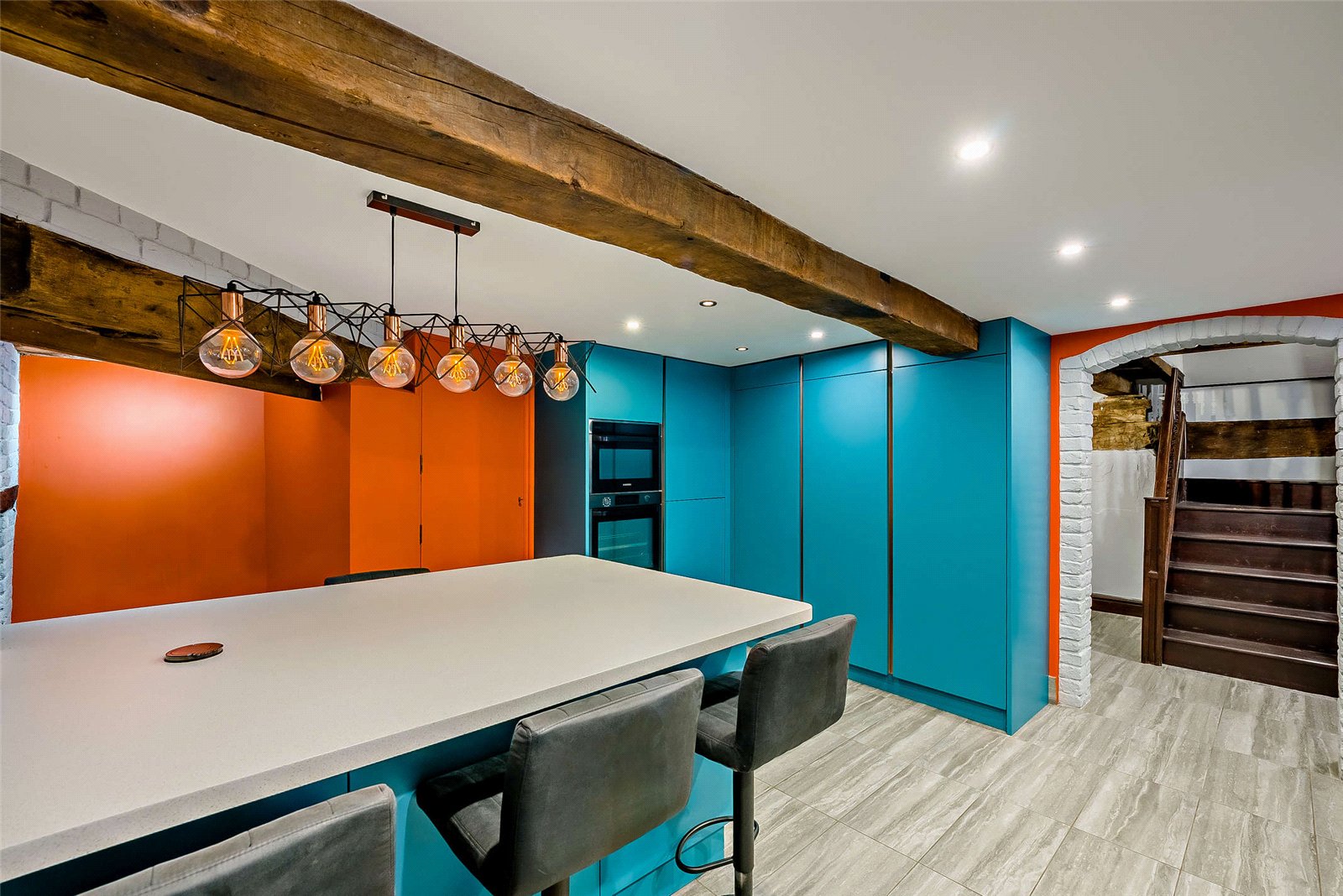 The heart of the property is its vibrant, state-of-the-art kitchen. Bold turquoise cabinetry, sleek integrated appliances and a central island with a built-in wine cooler create a striking yet highly functional space. Exposed beams and brick accents add warmth and rustic charm; this blend of the old and new sets the tone for the rest of the home.