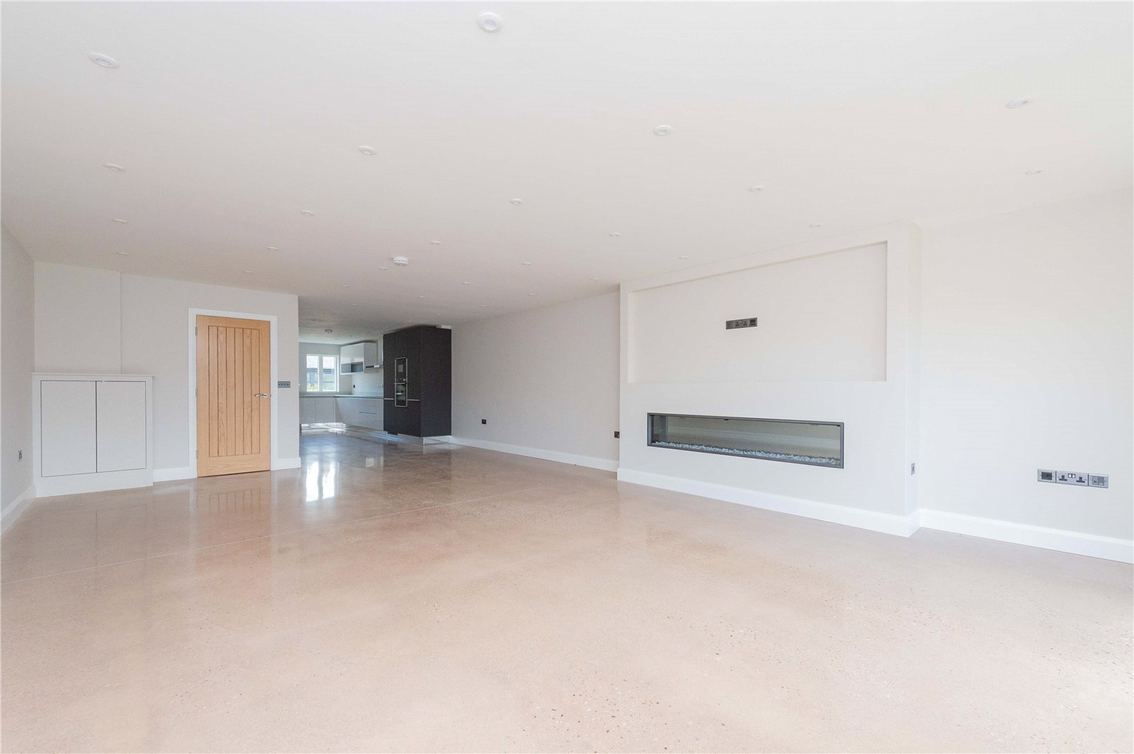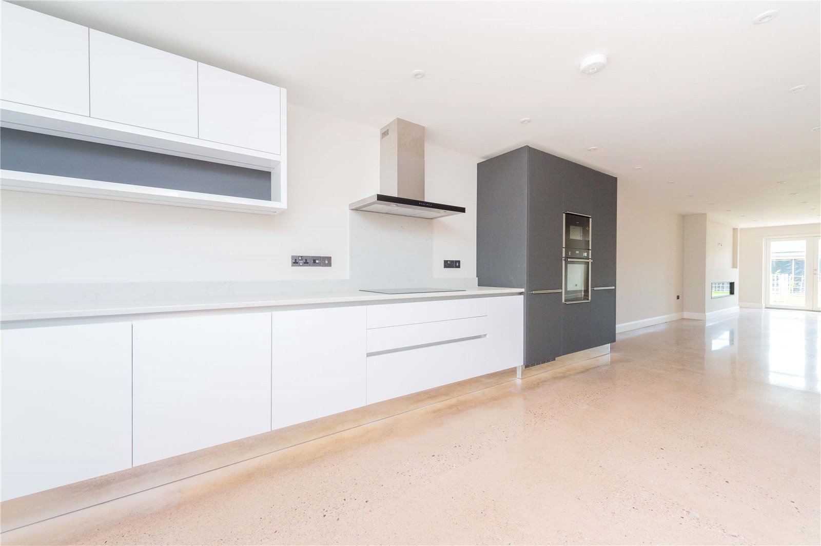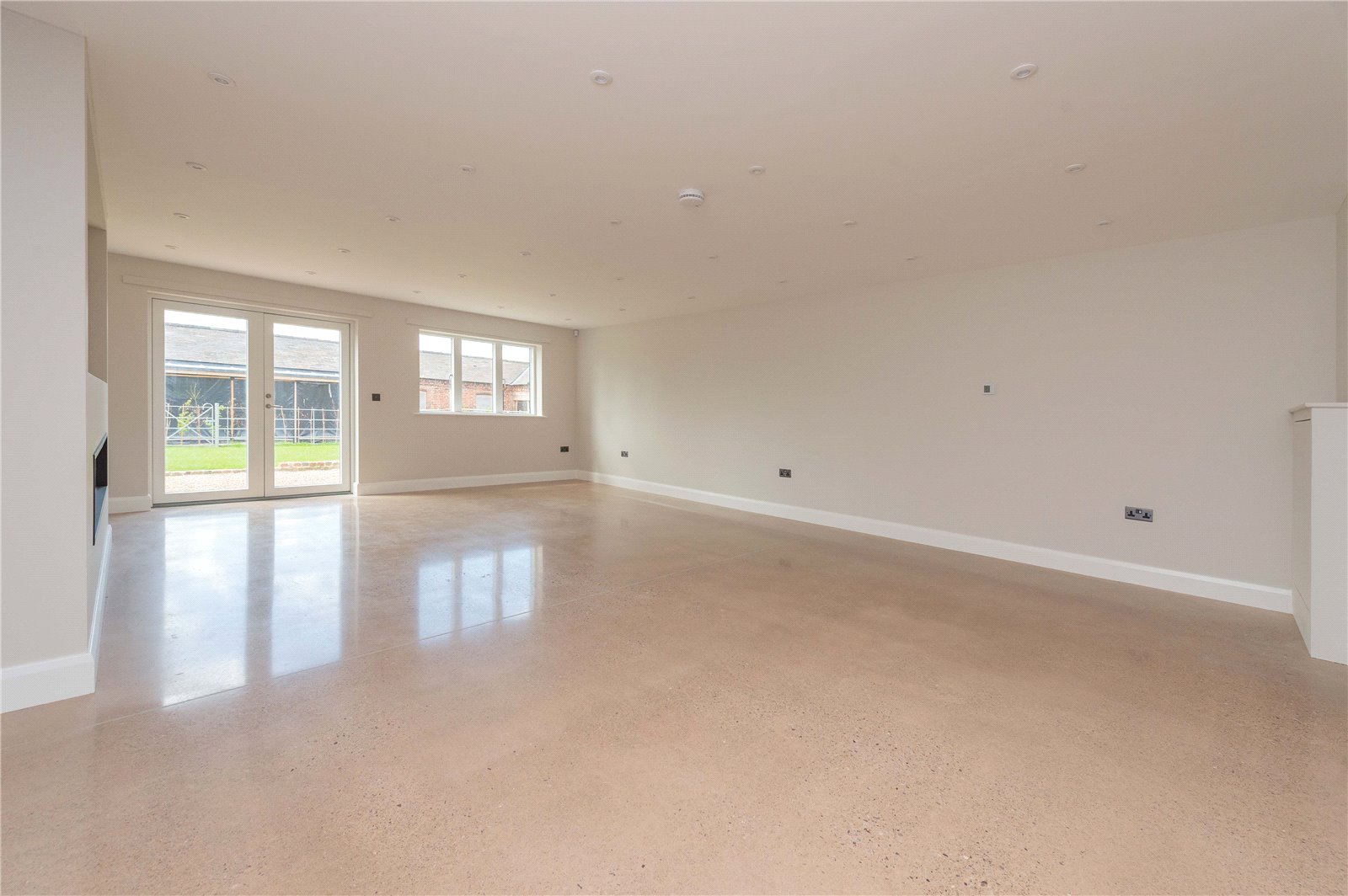 – An elegant and spacious open plan living area, including a high spec kitchen with integrated appliances (NEFF microwave, NEFF oven, Hoover fridge freezer, 4 ring Hob, NEFF dishwasher and washing machine), dining and living room with an alluring fireplace and media wall. French double doors that offer that seamless transition from the inside to the outside.