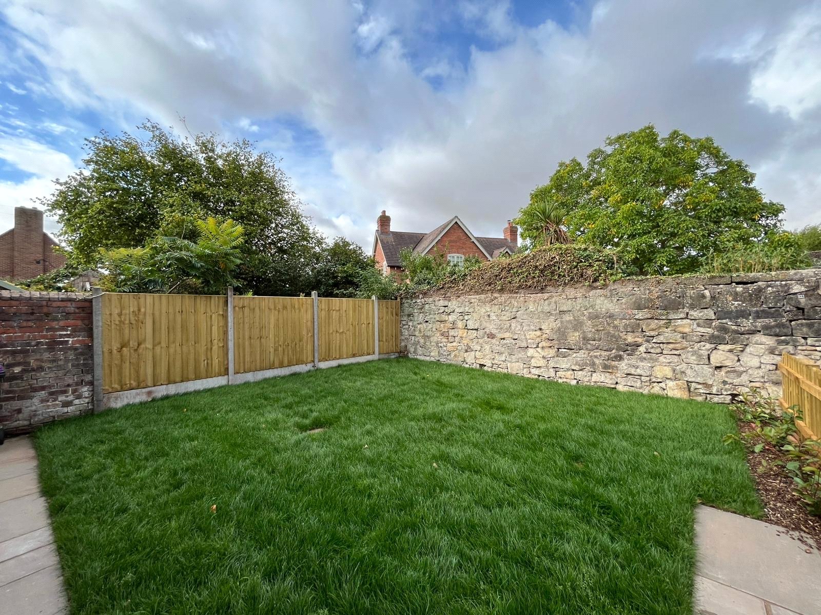 Private fenced garden laid to lawn with brick garden shed.